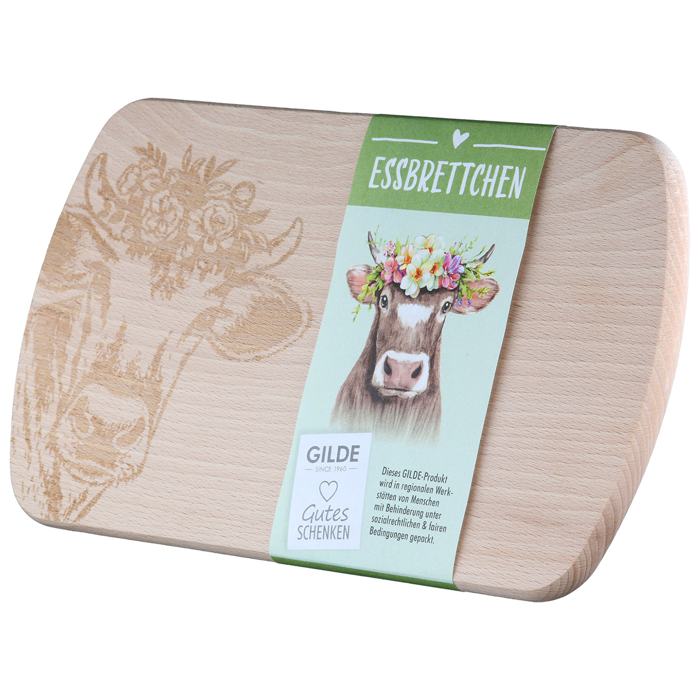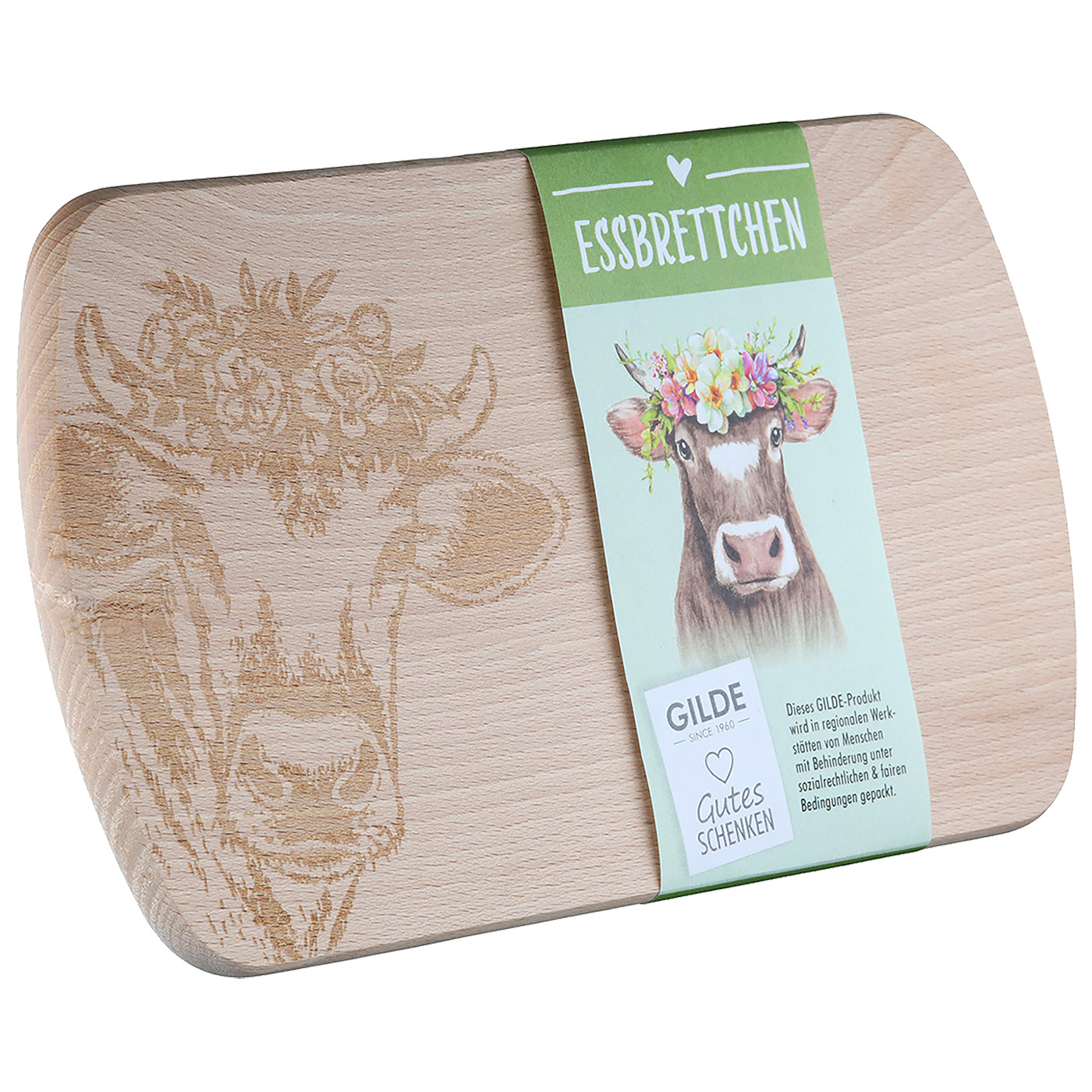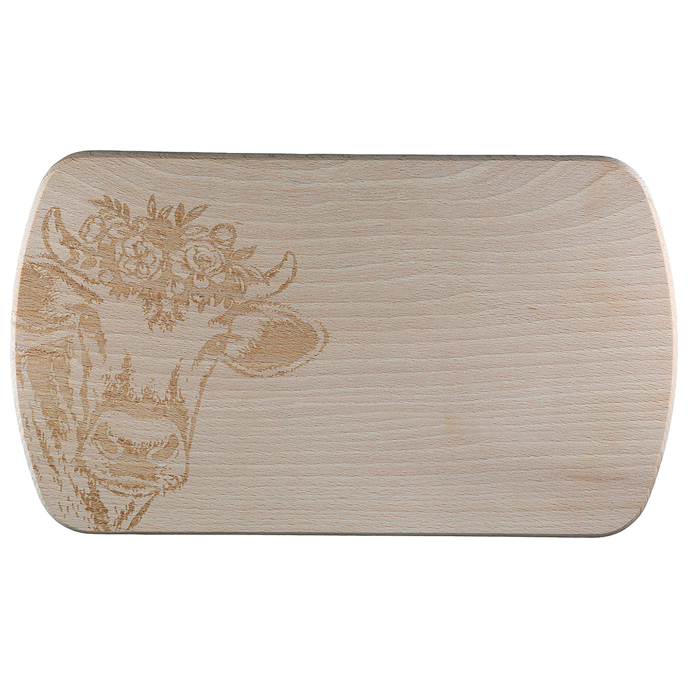 Brettchen mit Motiv Kuh "Adelheid" aus naturfarbenem Holz, rechteckig mit abgerundeten Ecken. Maße: 14 x 24 x 1cm