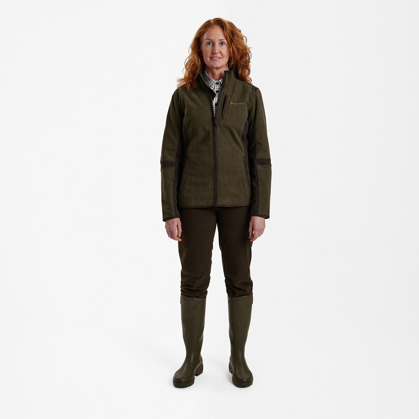 Die Lady Pam Bonded Fleece Jacke ist mit dem Deerhunter Stormliner ausgestattet und daher windfest und atmungsaktiv – zwei wichtige Features für jede aktive Outdoor-Lady. Der Besatz aus Wildlederimitat am Hals, am Reißverschluss vorne und an den Ärmelöffnungen sorgt für eine bequeme Passform und eine stilvolle Optik. Diese praktische Jacke bietet mehrere Aufbewahrungsmöglichkeiten. Sie hat zwei Vordertaschen, eine Brusttasche, eine großen Wildtasche und zwei Innentaschen, in der wertvollen Gegenstände sicher untergebracht sind. Belüftungsösen unter den Armen sorgen für zusätzliche Luftzirkulation.