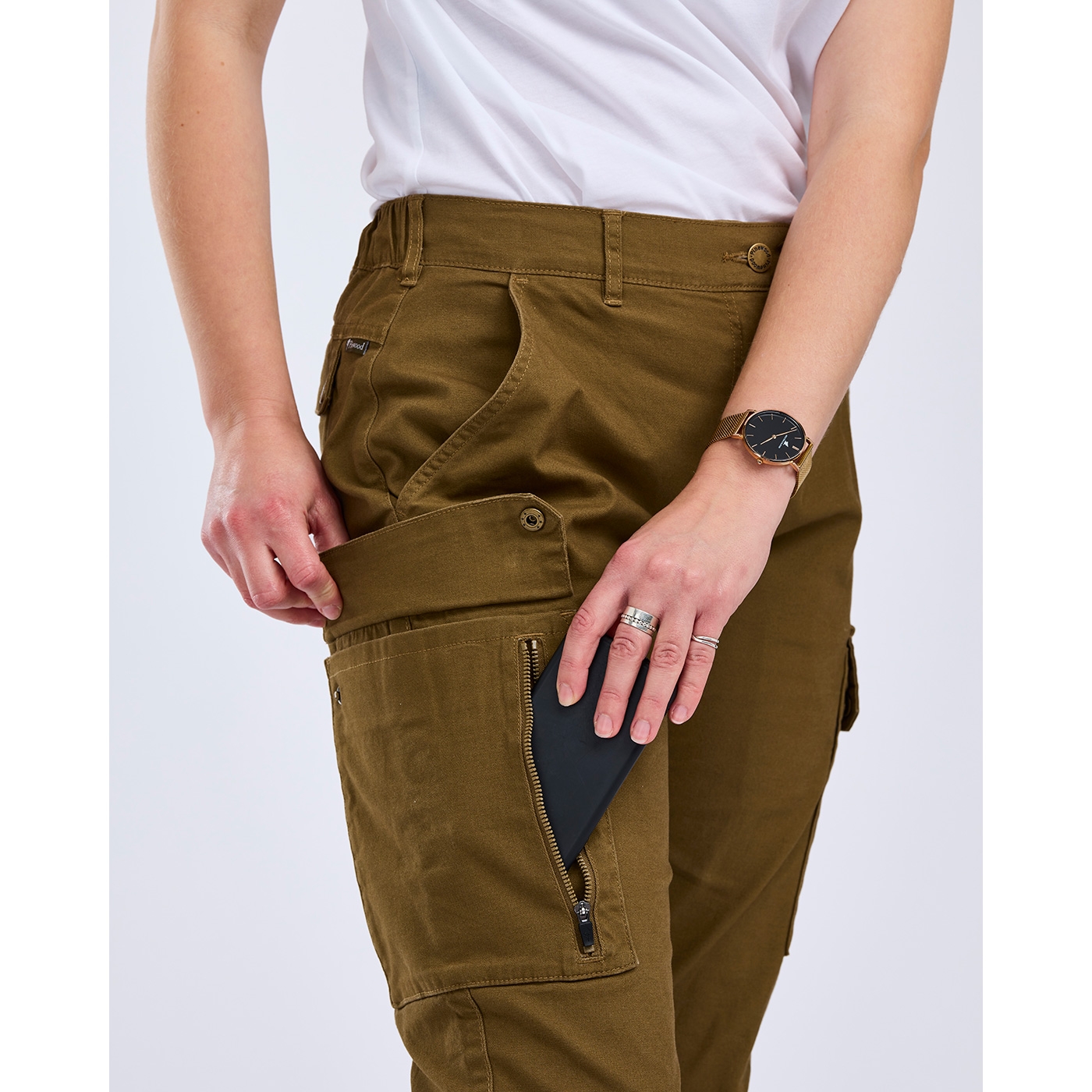- 2 seitliche Einschubtaschen, 2 verschließbare Gesäßtaschen, 1 großzügige Reißverschluss-Beintasche