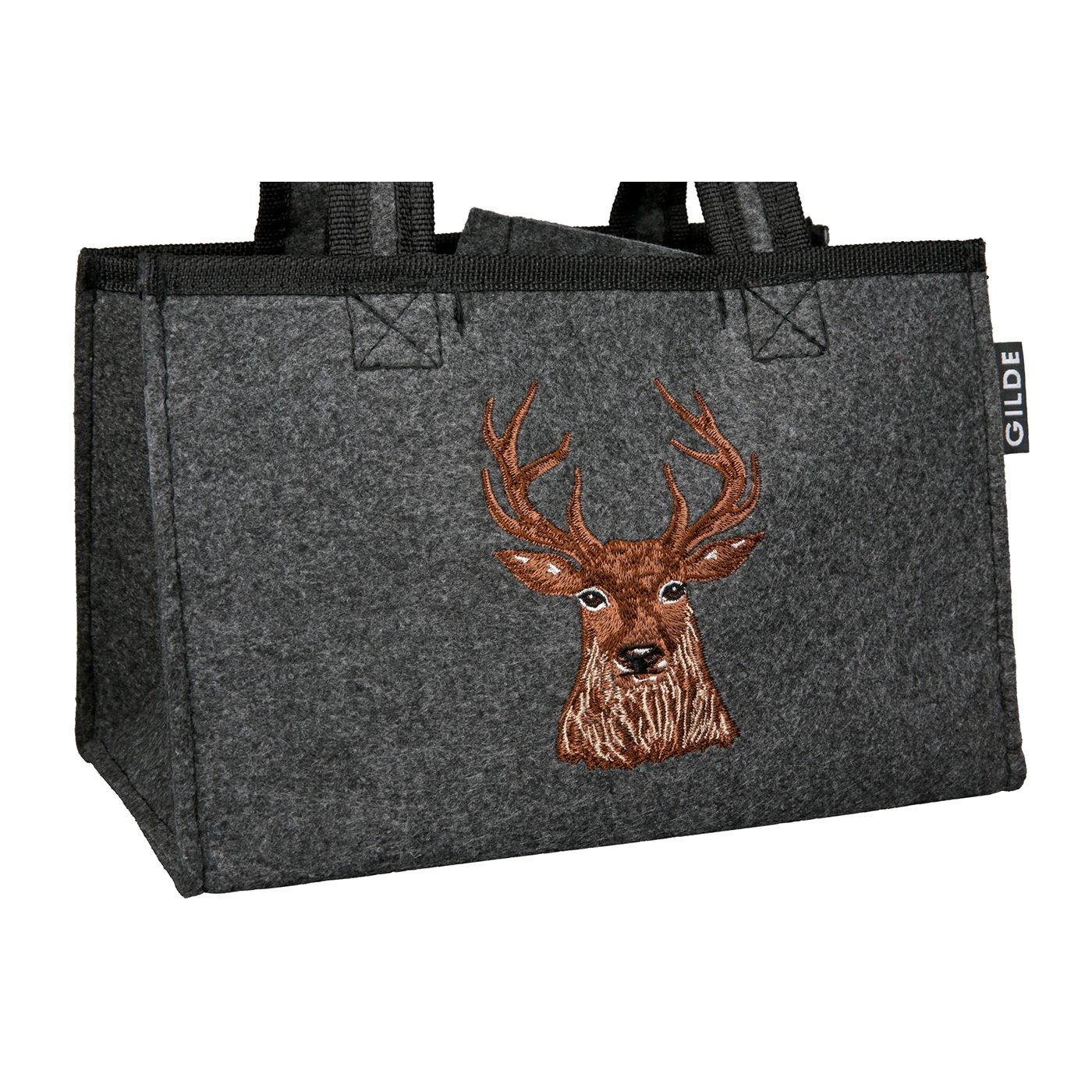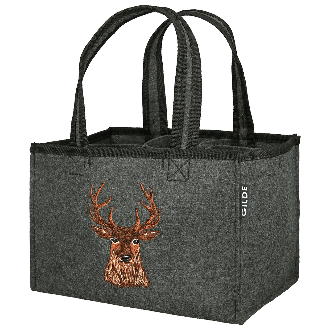 Die dekorative, robuste Filzflaschentasche mit urigem Hirsch-Motiv. Belastbarkeit bis zu 8 kg. Platz für 6 Flaschen. Maße: 14 x 23 x 15 cm