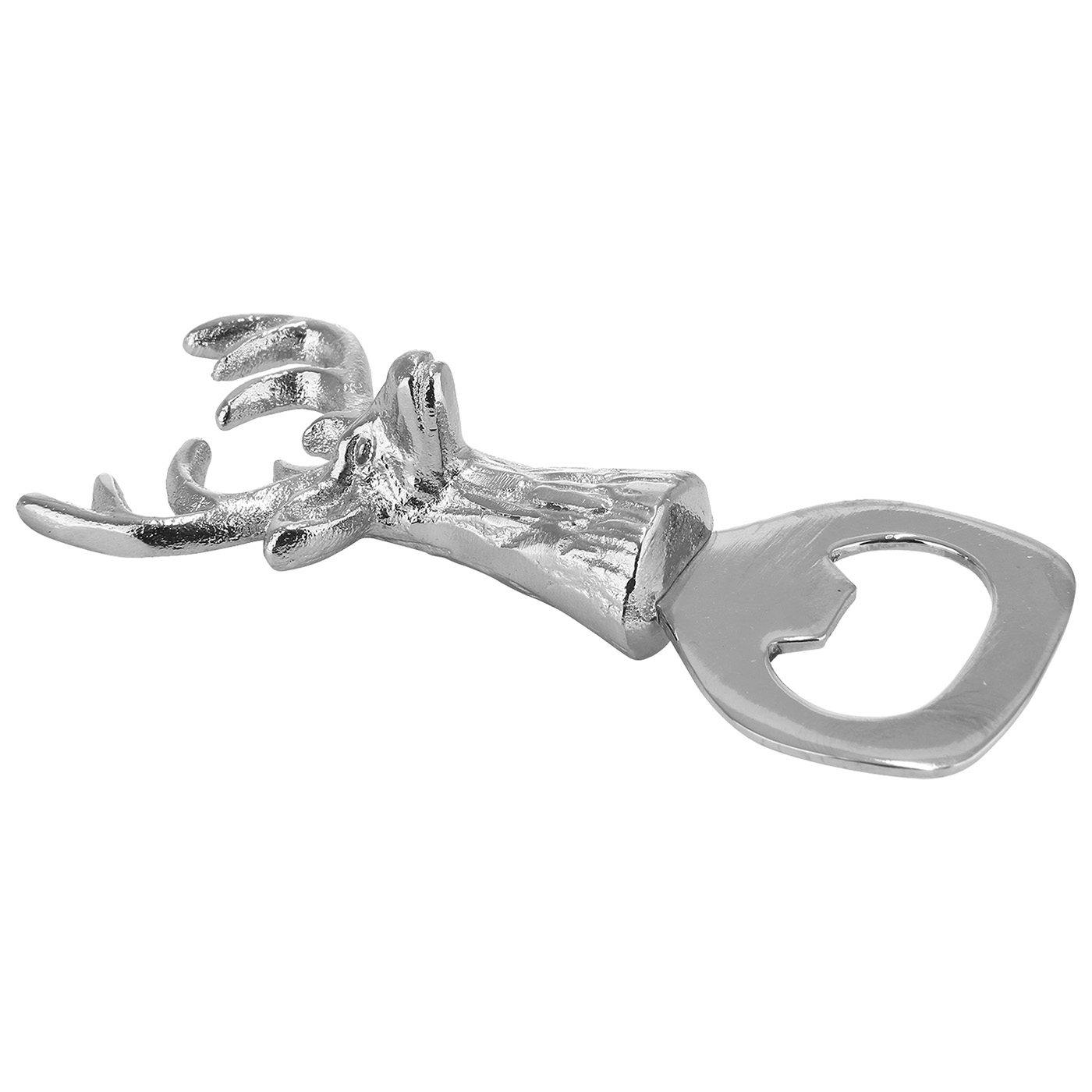 Dekorativer silberfarbener Flaschenöffner mit Hirschkopf-Motiv aus Aluminium. Nicht spülmaschinengeeignet. Maße: B 4,5 x H 11 cm