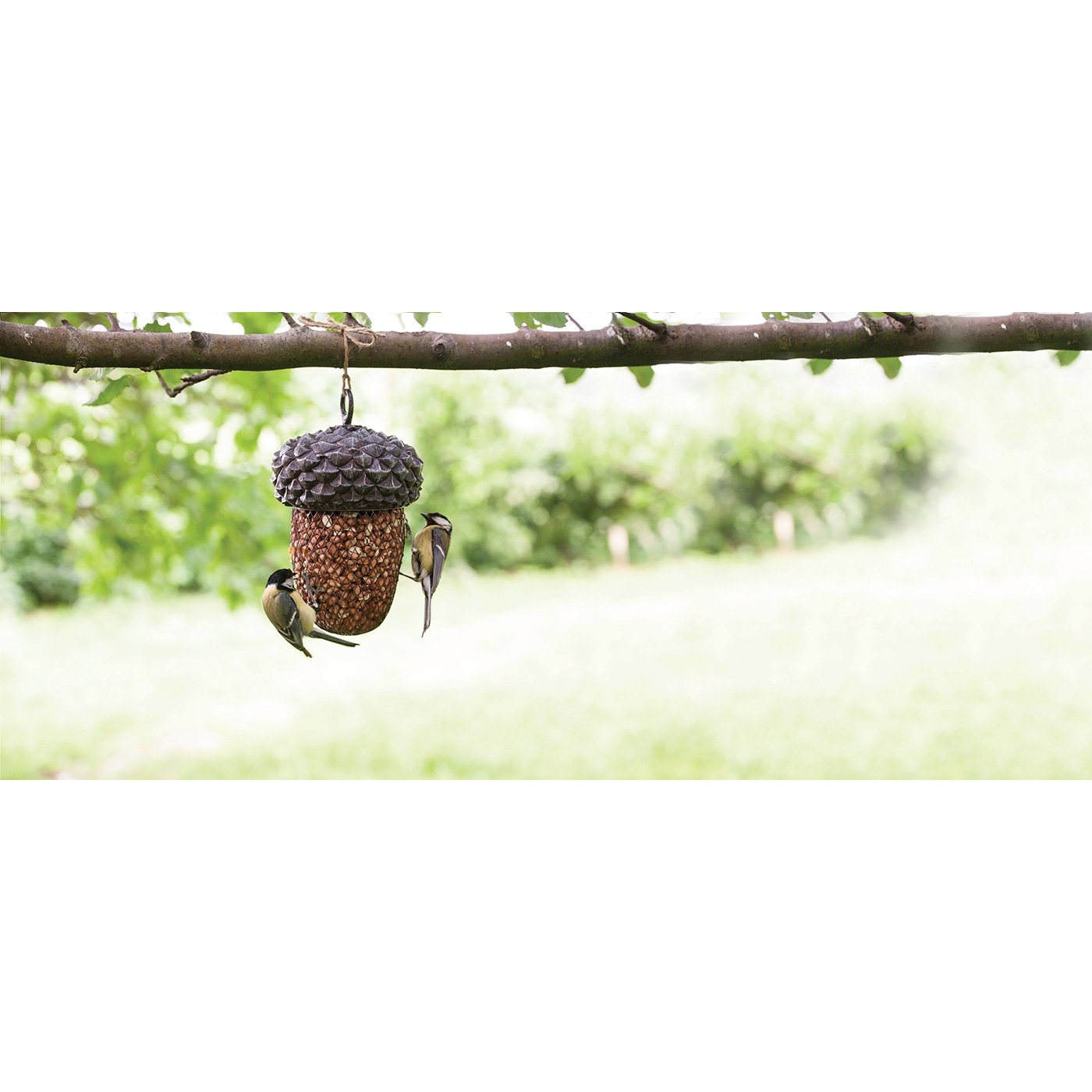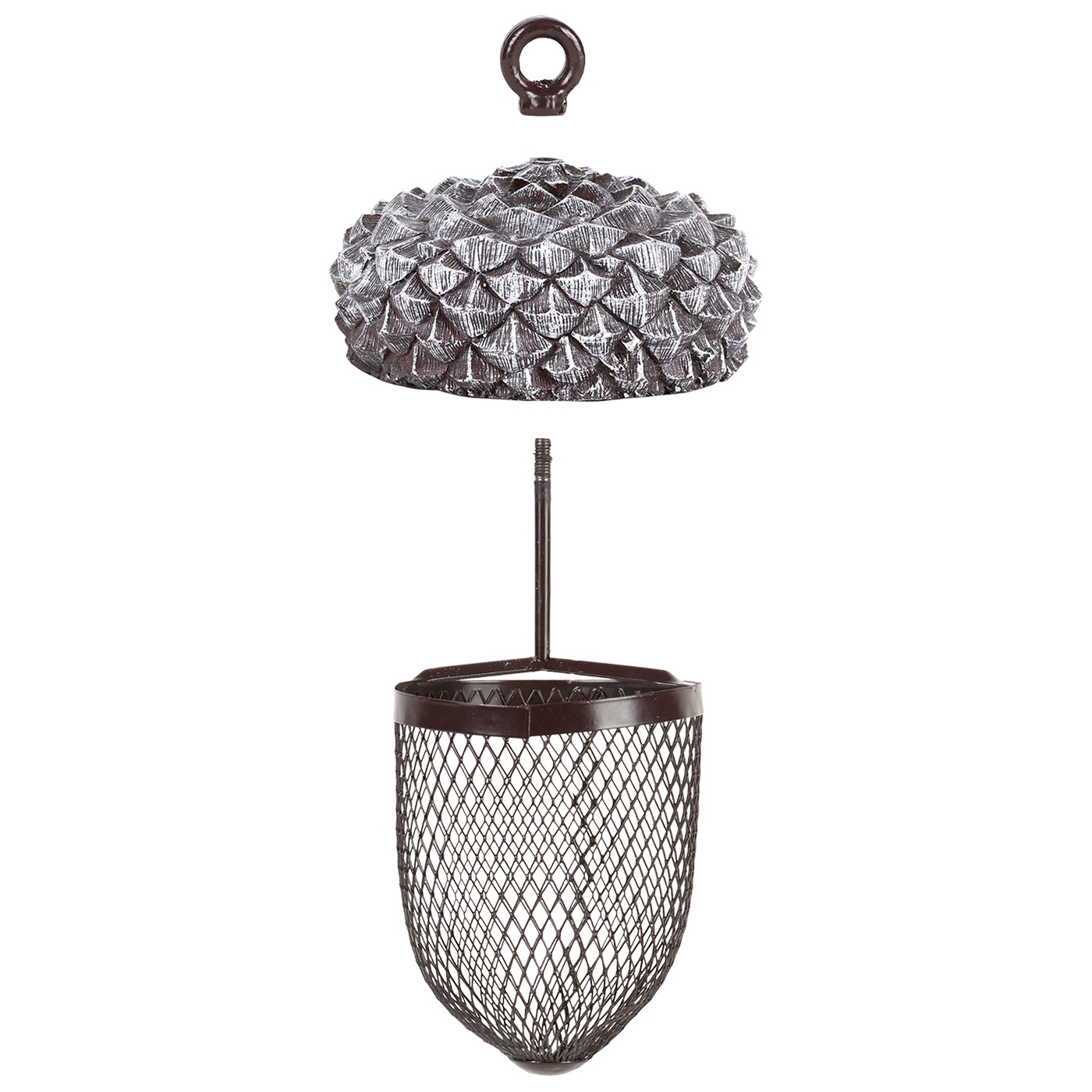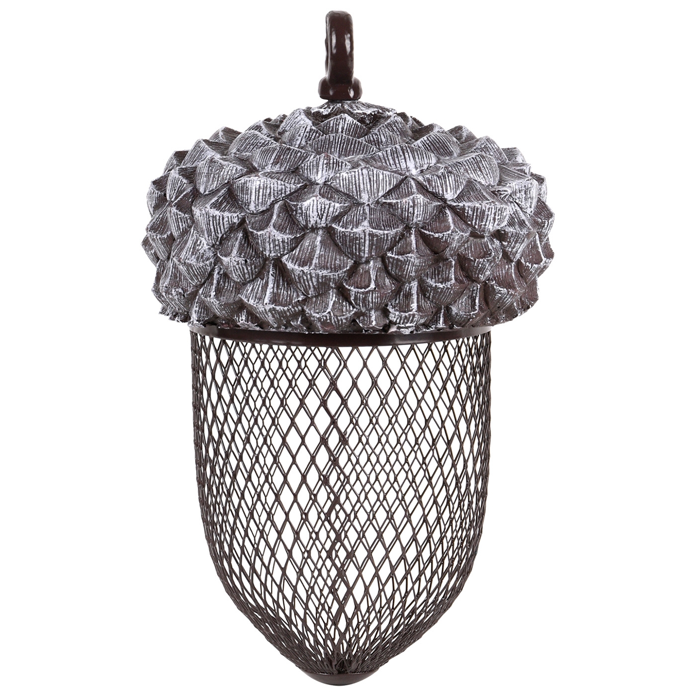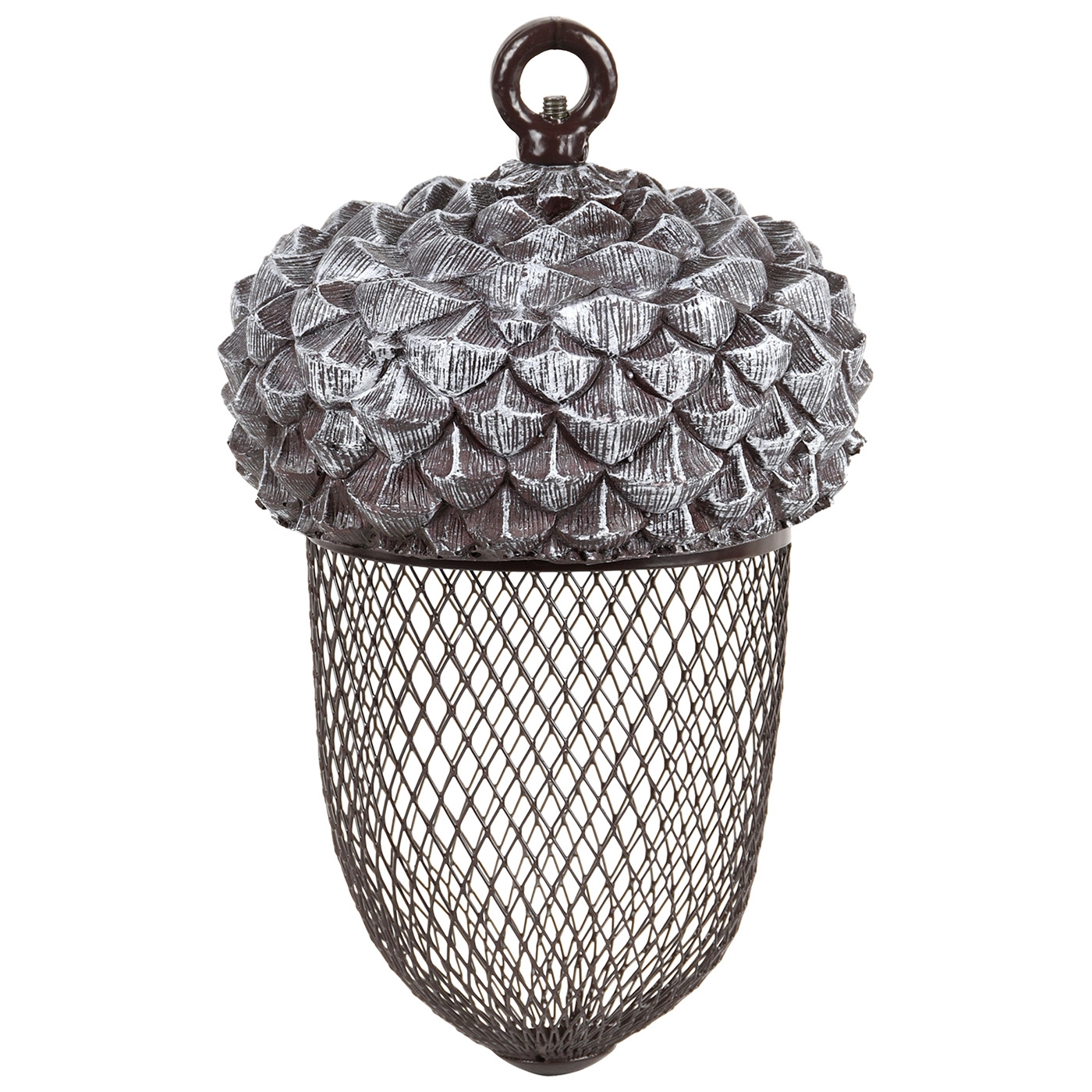 Gönnen Sie den Vögeln im Garten dieses dekorative, eichelförmige Futtersilo aus einer Materialkombination von Eisen und PVC. Diese Eichel in offener Struktur, kann z. Bsp. mit Erdnüssen befüllt werden, so dass die Vögel bequem ans Futter gelangen. Zum einfachen Befüllen, lässt sich der Hut problemlos abschrauben. Futter ist nicht im Lieferumfang enthalten. Maße: L 13,5 x T 13,5 x H 20,8 cm