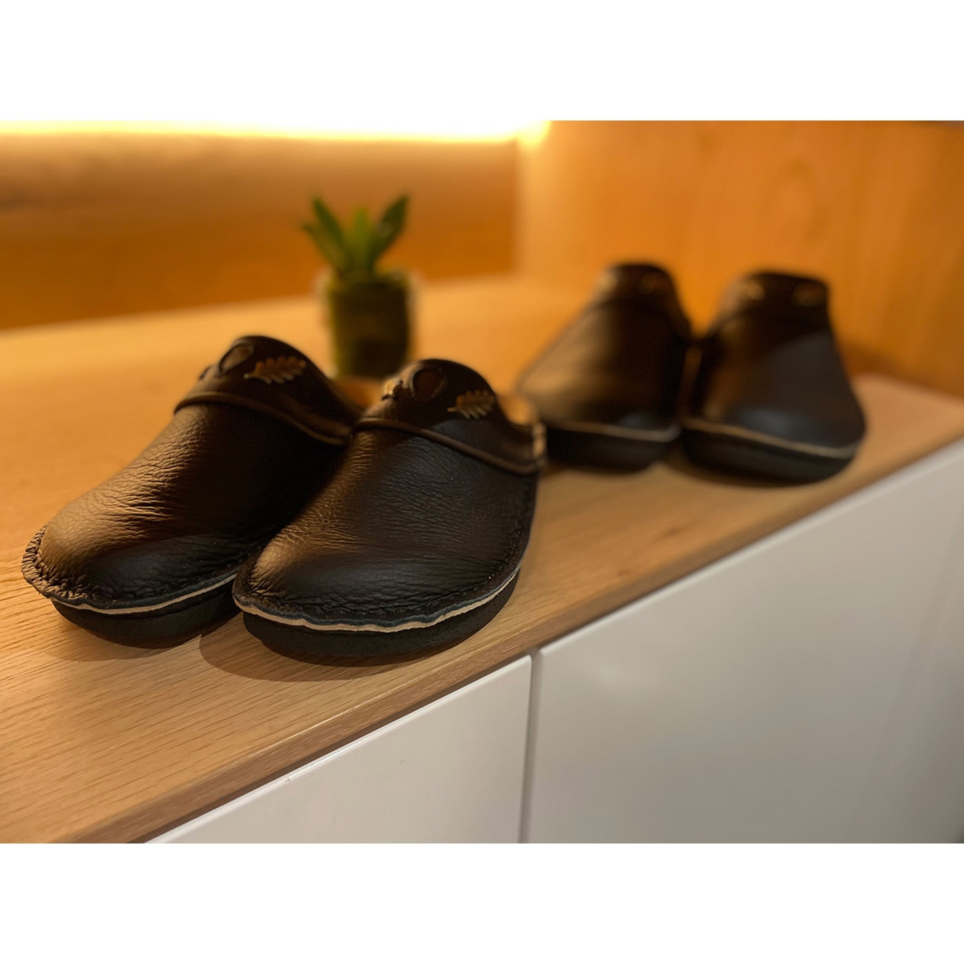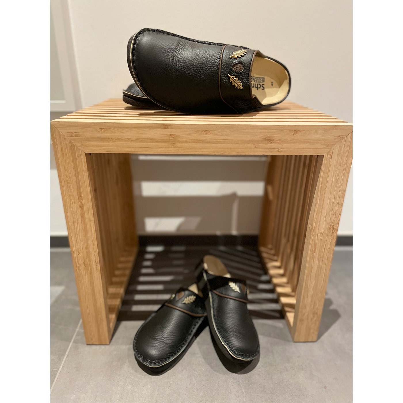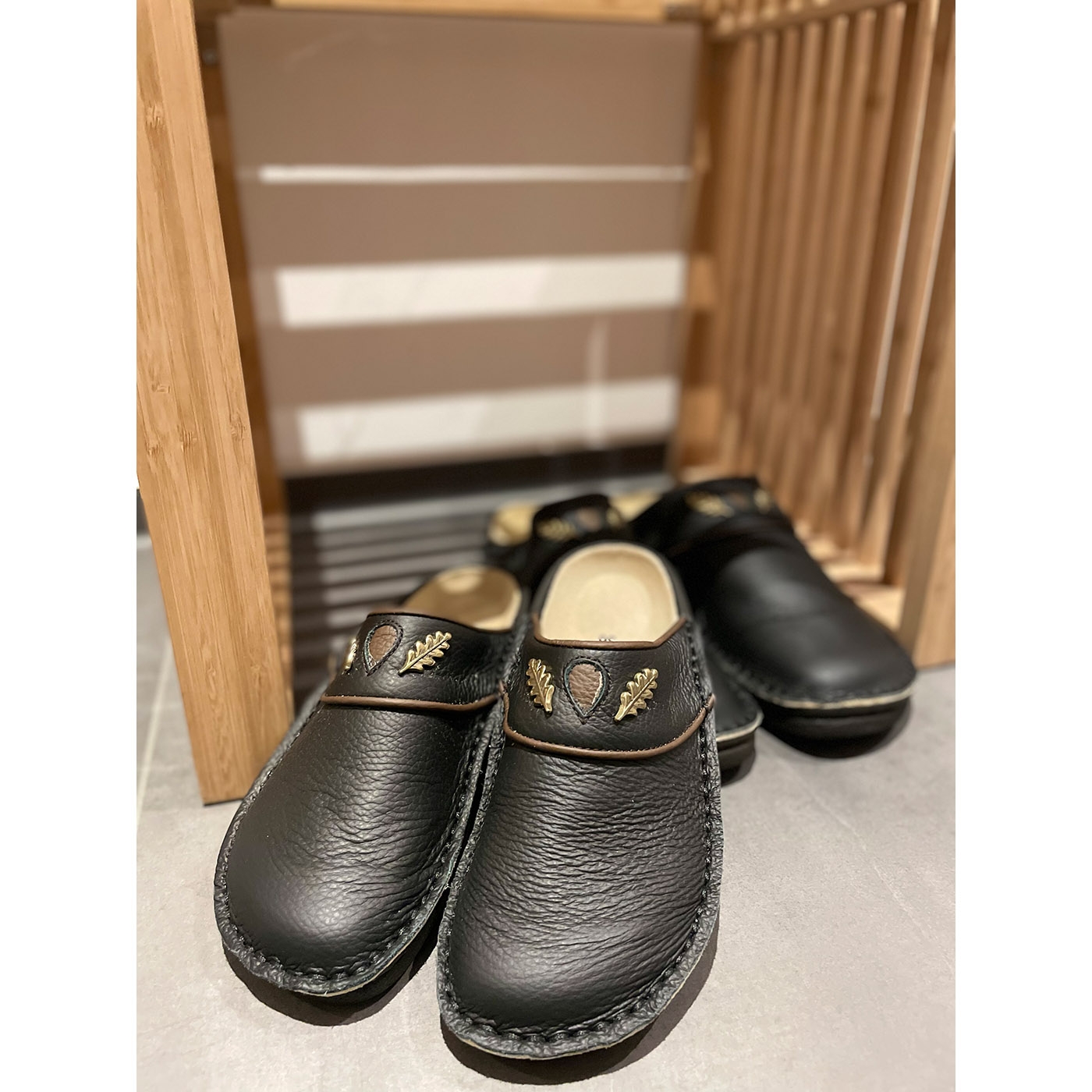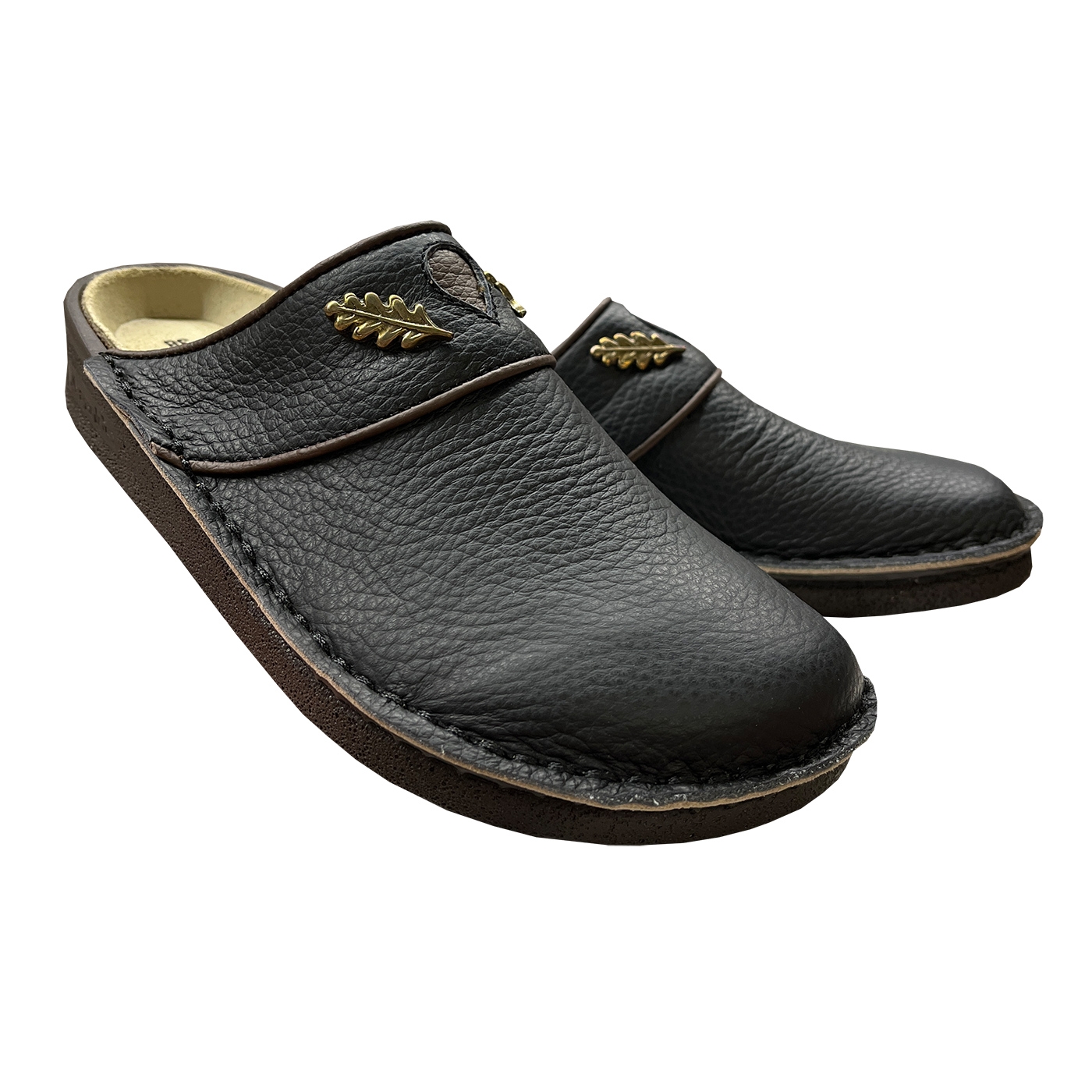 Unser Klassiker seit vielen Jahren! Die Schmidt's PANTOS Pantoffeln aus handgenähtem Rindleder in hochwertiger zwiegenähter Qualität sind der ideale Begleiter für Ihre Freizeit und Outdoor-Aktivitäten. Mit einer robusten Polyurethan-Sohle und einem bequemen Lederfußbett bieten diese Hausschuhe Stabilität und Komfort bei der Hausarbeit, im Garten oder in der Jagdhütte. Dieses Modell in edlem Schwarz ist mit einer goldfarbenen Eichenlaub-Applikation aus Metall und Leder versehen, was es zu einem echten jagdlichen Hingucker macht – sowohl für Hausmann als auch für Hausfrau. Die ergonomische Form und die weite Passform sorgen für einen sicheren und angenehmen Stand. Hergestellt in unserer europäischen Produktion, haben sich diese Pantoffeln seit vielen Jahren als verlässliche Wohlfühlschuhe bewährt – perfekt für gemütliche Stunden im Winter und nach einem erfolgreichen Tag auf der Jagd.