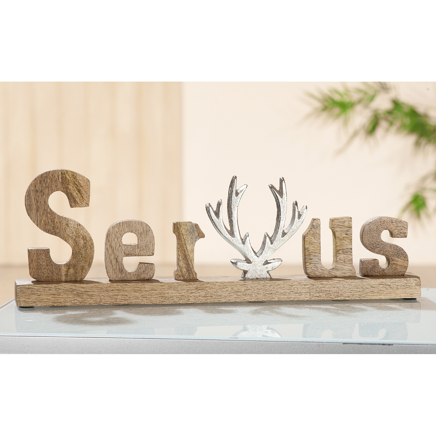 Dekorativer, orgineller Schriftzug "Servus" aus naturfarbenen Mangoholz mit Geweihmotiv aus Aluminium. Maße: 46 x 5 x 14cm (LxBxH)