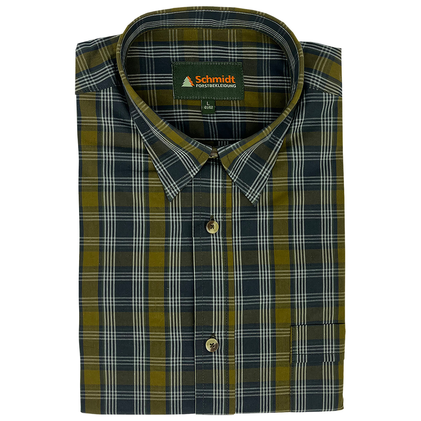 Klassisches Kurzarm-Karohemd von Schmidt mit Umlegekragen – der perfekte Begleiter für Ihr nächstes Outdoor-Abenteuer oder den Jagdausflug. Hergestellt aus hautsympathischer Baumwolle bietet dieses Hemd höchsten Tragekomfort, selbst bei längeren Einsätzen im Freien. Die bequeme Weite und die optimale Rückenlänge sorgen für eine ideale Passform. Die durchgehende Knopfleiste ist mit stilvollen Knöpfen in Naturoptik versehen, zudem gibt es links eine praktische Brusttasche mit Knopfverschluss für zusätzlichen Stauraum von kleinen Utensilien. Ob auf der Pirsch oder beim Wandern – mit diesem Karohemd sind Sie immer gut ausgestattet.