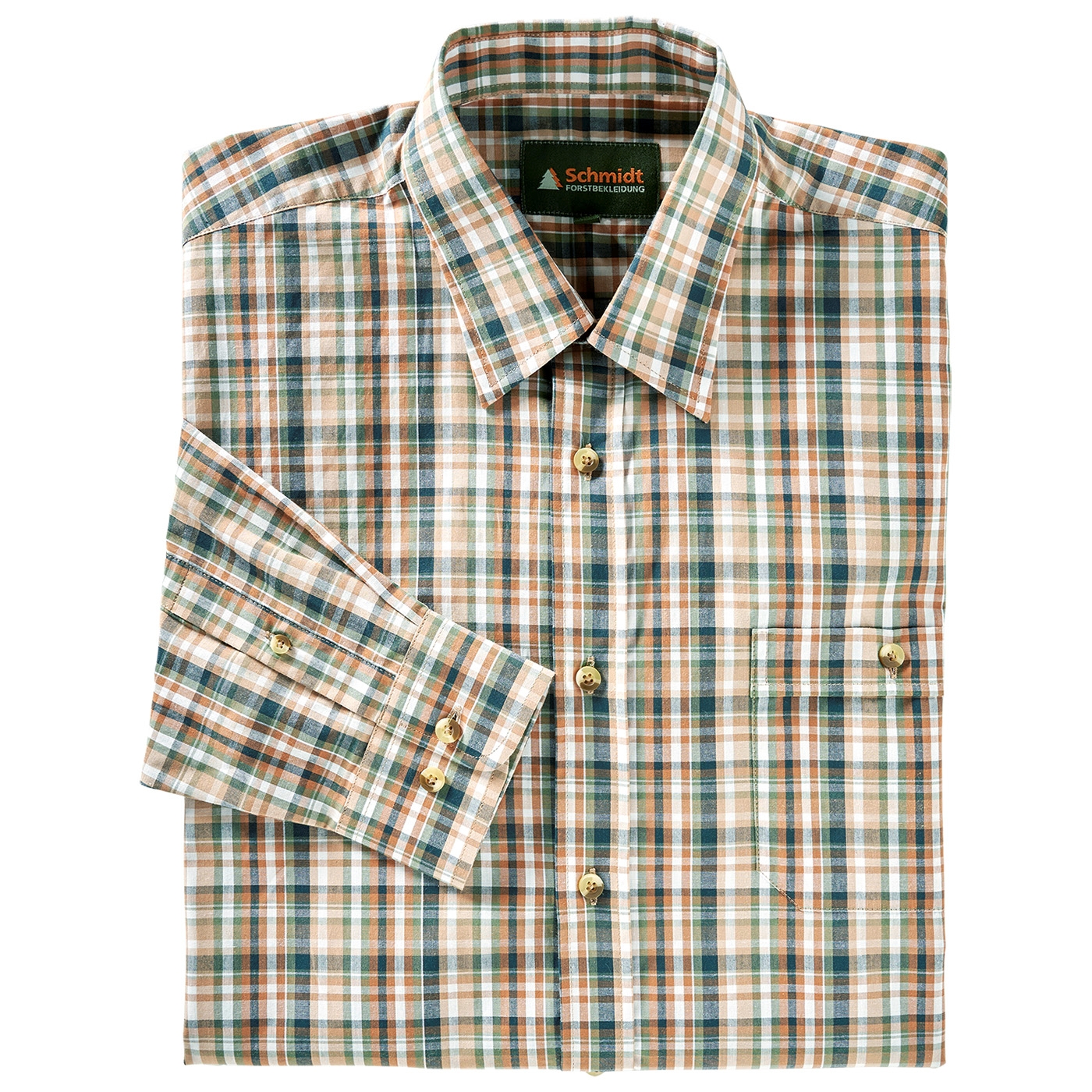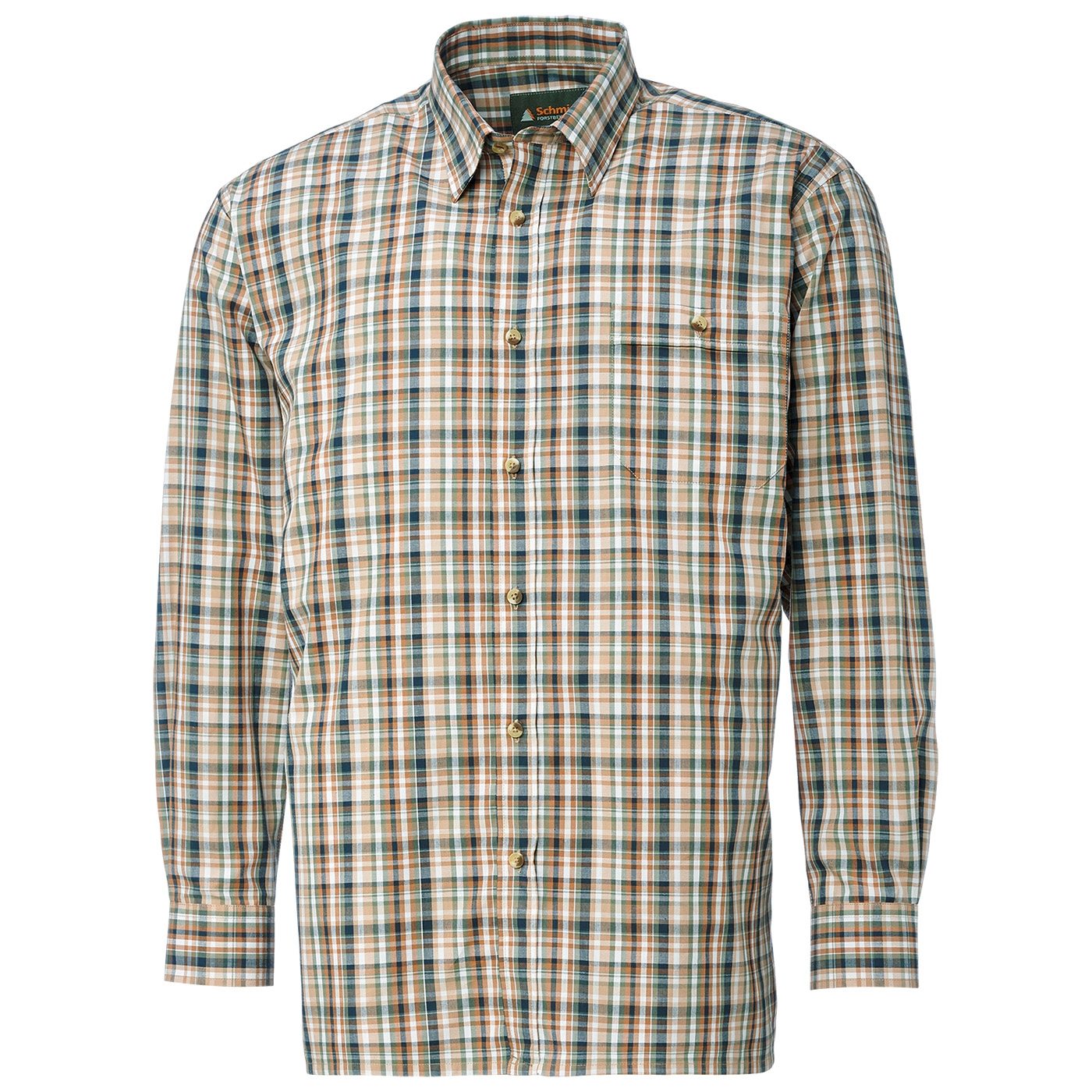 Klassisches Karohemd von Schmidt mit Umlegekragen – der perfekte Begleiter für Ihr nächstes Outdoor-Abenteuer oder den Jagdausflug. Hergestellt aus hautsympathischer Baumwolle bietet dieses Hemd höchsten Tragekomfort, selbst bei längeren Einsätzen im Freien. Die bequeme Weite und die optimale Rückenlänge sorgen für eine ideale Passform. Die durchgehende Knopfleiste ist mit stilvollen Knöpfen in Naturoptik versehen, zudem gibt es links eine praktische Brusttasche mit Knopfverschluss für zusätzlichen Stauraum von kleinen Utensilien. Ob auf der Pirsch oder beim Wandern – mit diesem Karohemd sind Sie immer gut ausgestattet.