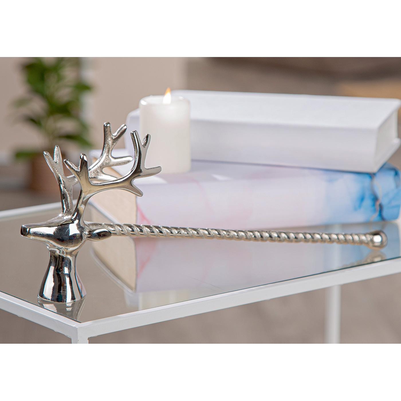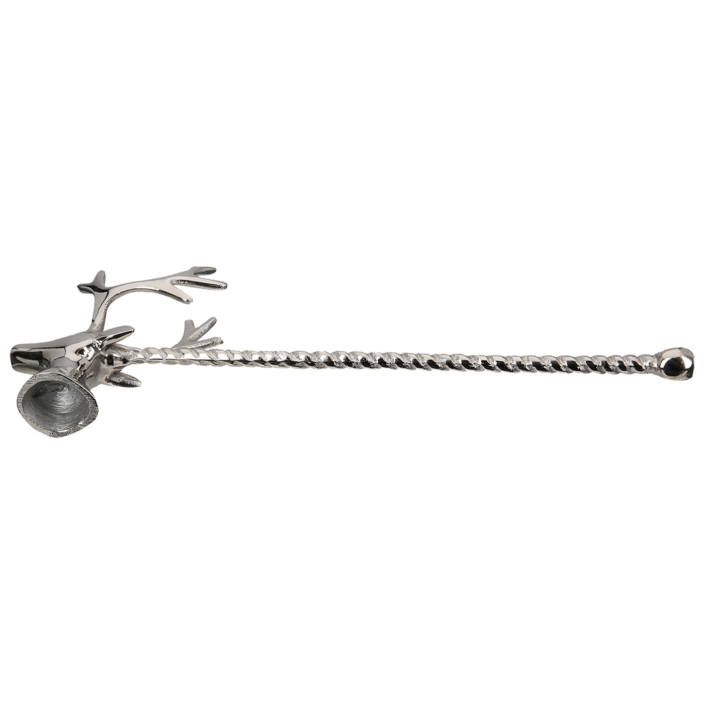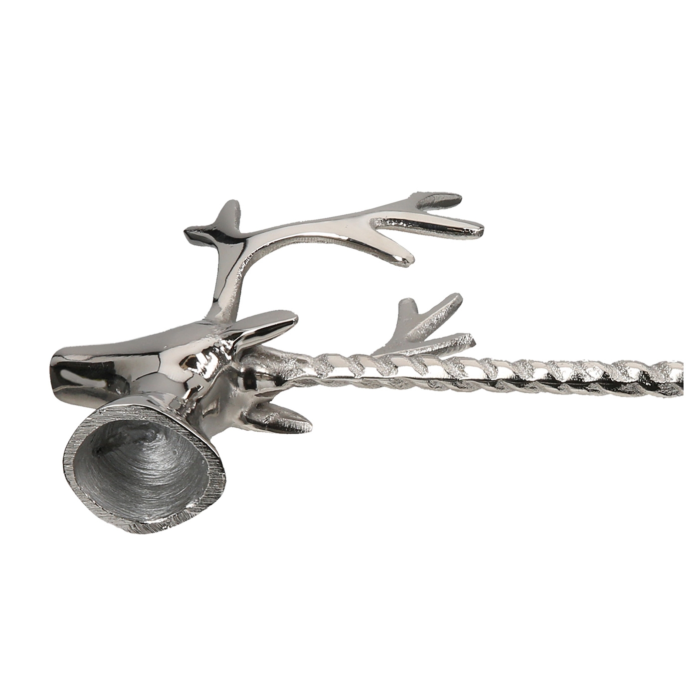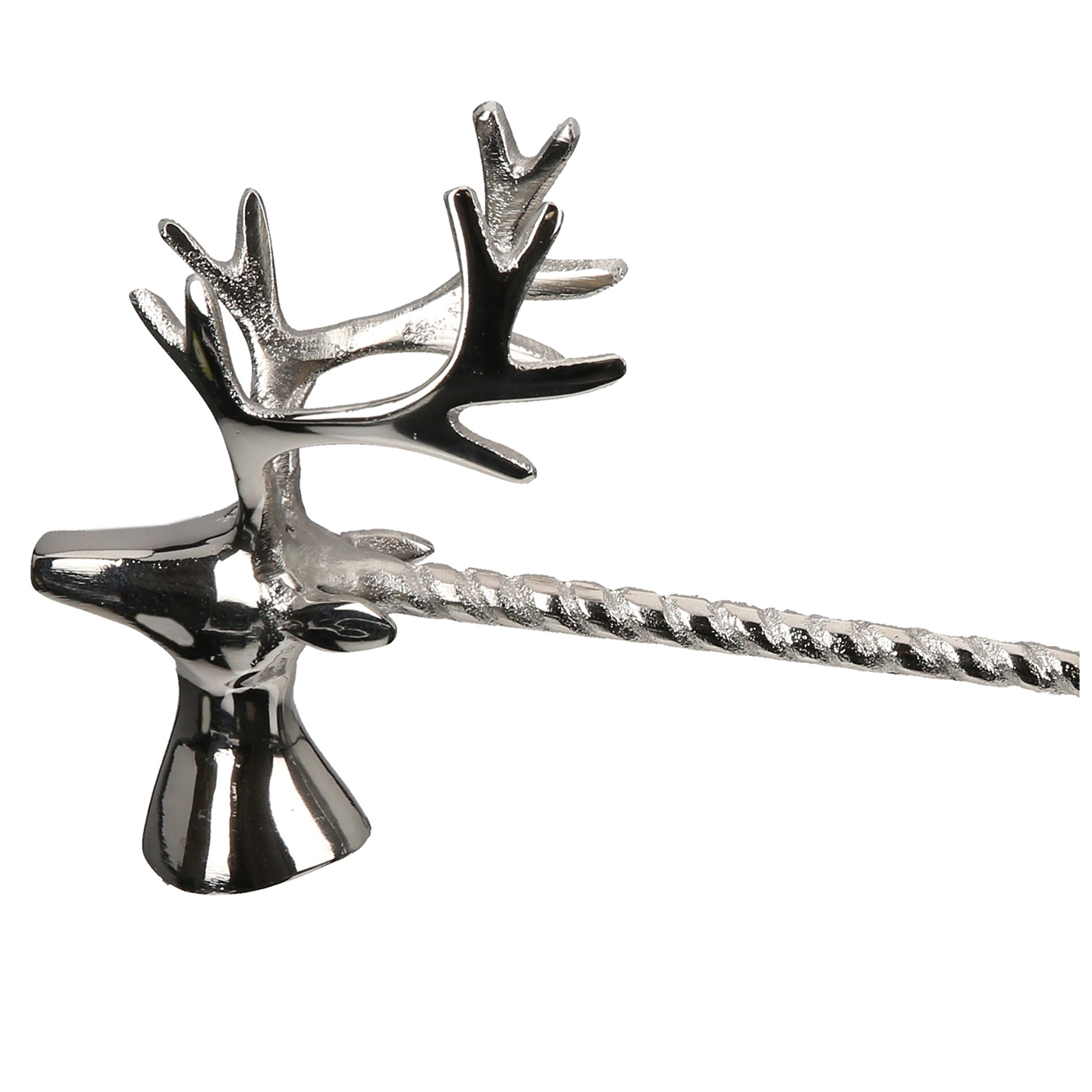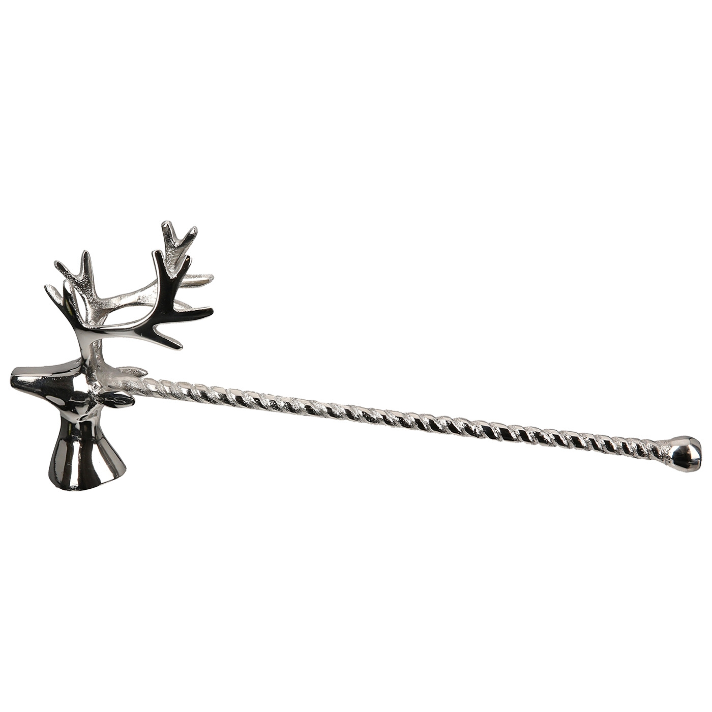 Stilvoller Kerzenlöscher mit Hirschkopf in silber aus Aluminium. Maße: B 4,5 x L 13,5 x H 14cm.