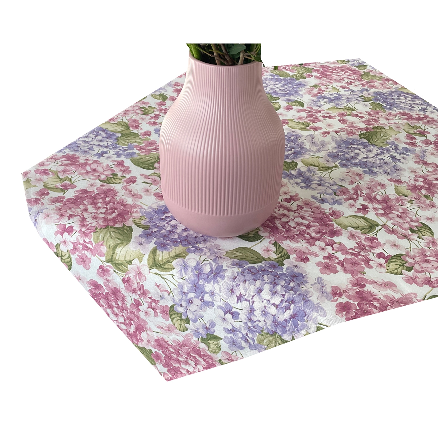Mitteltischdecke mit floralem Hortensienmotiv. Ein Blickfang bei gemütlichen Tischrunden.
