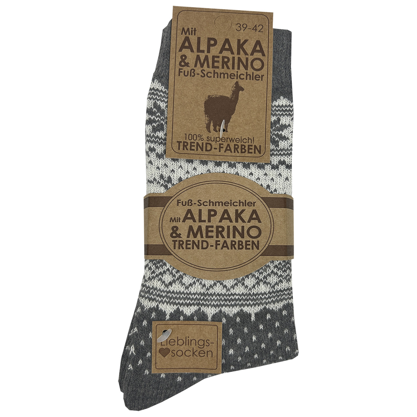 Hochwertige Socke mit Alpaka- und Merinowolle im klassischen schönen Norwegerdessins, weich und wärmend. Spitze und Ferse sind verstärkt für ein besonders langes Sockenleben. Die Merinowolle bietet besonders guten Schutz gegen Kälte, durch die Fähigkeit der hohen Feuchtigkeitsaufnahme wärmt diese Wolle sogar noch im feuchten Zustand zuverlässig. Sie ist besonders fein und elastisch und bietet weichen Tragekomfort ohne zu kratzen. Hergestellt in Europa.
