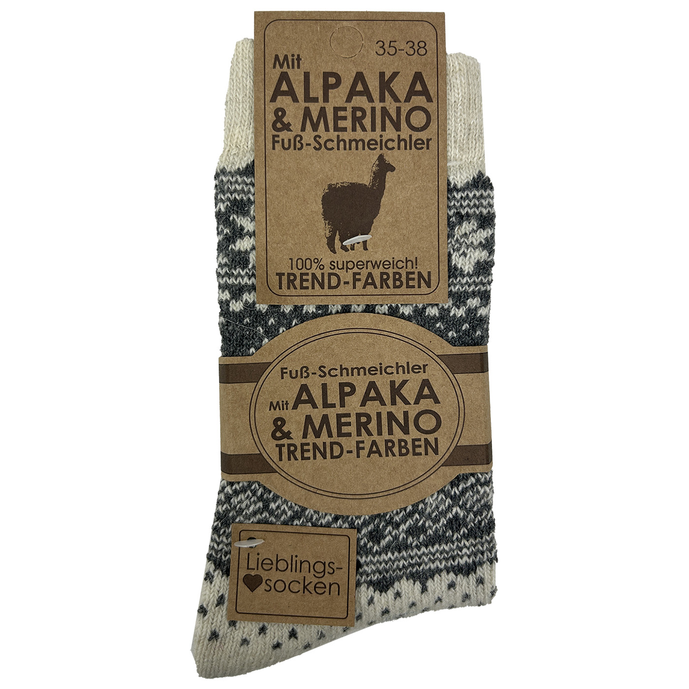 Hochwertige Socke mit Alpaka- und Merinowolle im klassischen schönen Norwegerdessins,weich und wärmend. Spitze und Ferse sind verstärkt für ein besonders langes Sockenleben. Die Merinowolle bietet besonders guten Schutz gegen Kälte, durch die Fähigkeit der hohen Feuchtigkeitsaufnahme wärmt diese Wolle sogar noch im feuchten Zustand zuverlässig. Sie ist besonders fein und elastisch und bietet weichen Tragekomfort ohne zu kratzen. Hergestellt in Europa.