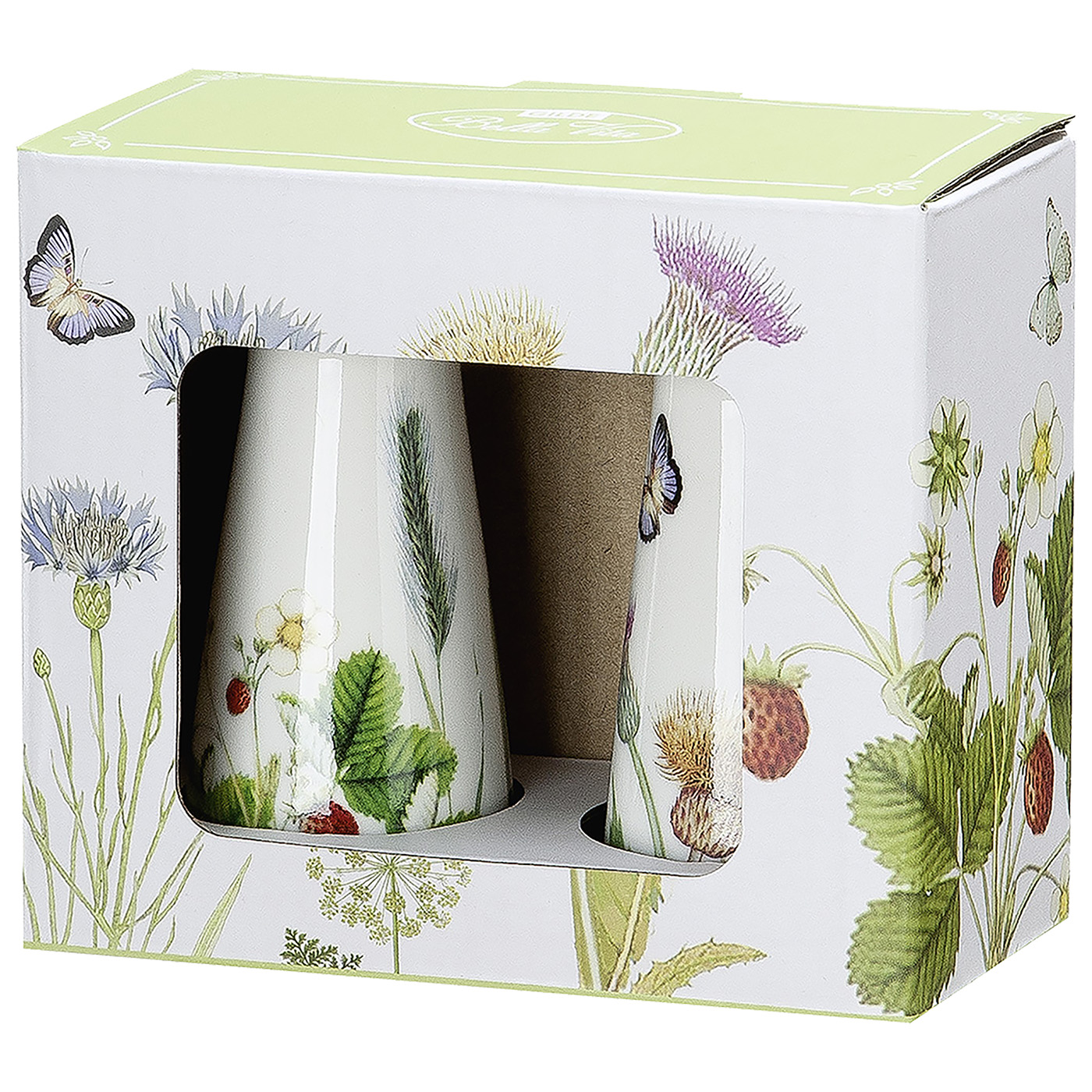 Salz-/&Pfefferstreuer "Wild Flowers" mit trendigen Wildblumendesign und Schmetterlingen aus weißem Porzellan, lebensmittelecht, spülmaschinenfest und mikrowellengeeignet. In dekorativer Geschenkverpackung mit Blüten-/Schmetterlingdesign "Bella Vita".Höhe: 8,7cm, Durchmesser: 4cm