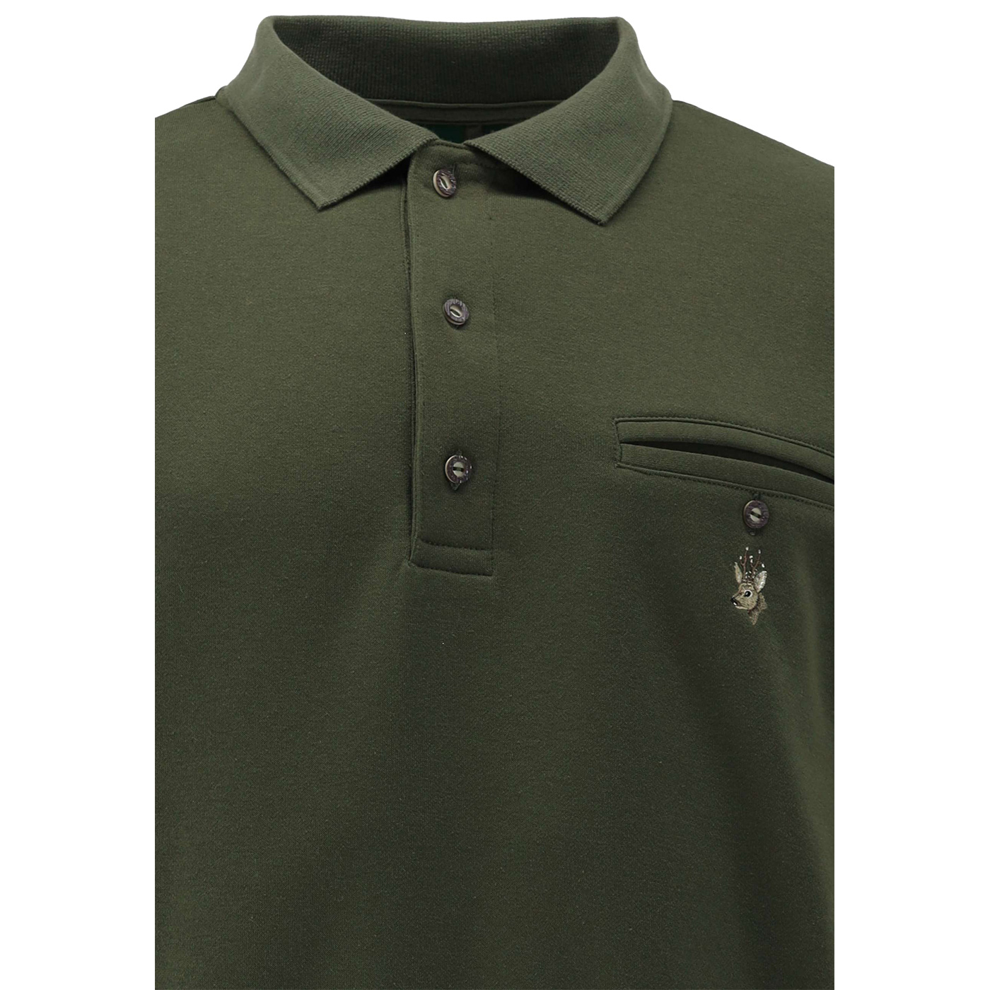 Klassisches, langarm Sweatshirt mit Polokragen von OS-Trachten. Eine Brusttasche links mit Knopfverschluss mit aufgesticktem Rehbock-Kopf. Der Polokragen mit 3 Knöpfe in Naturoptik und die dezente Stickerei sorgen für einen rustikalen, sportlichen Blickfang. Elastische Bündchen an Ärmel- und Saumabschluss. Dieses Jagd-Polo-Shirt im Regular Fit ist angenehm, bequem zu tragen, die optimale Wahl für Jagd, Freizeit und Alltag. Bitte Waschhinweise beachten.