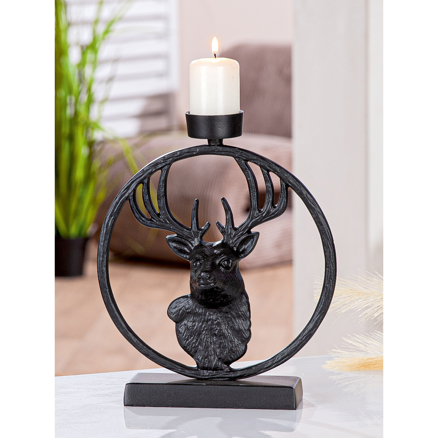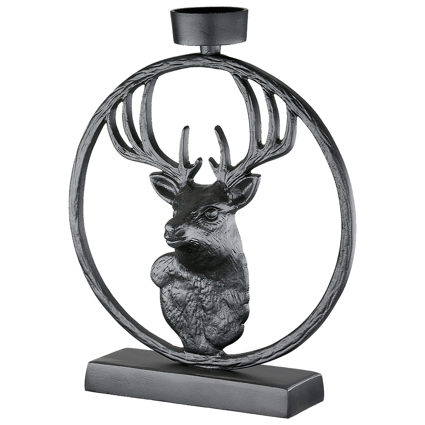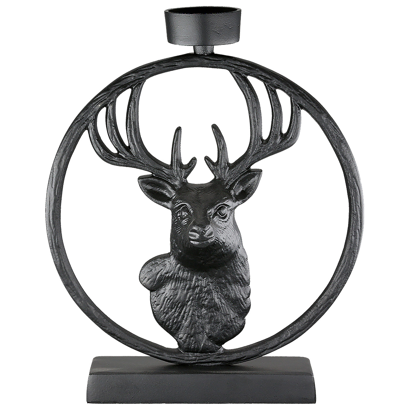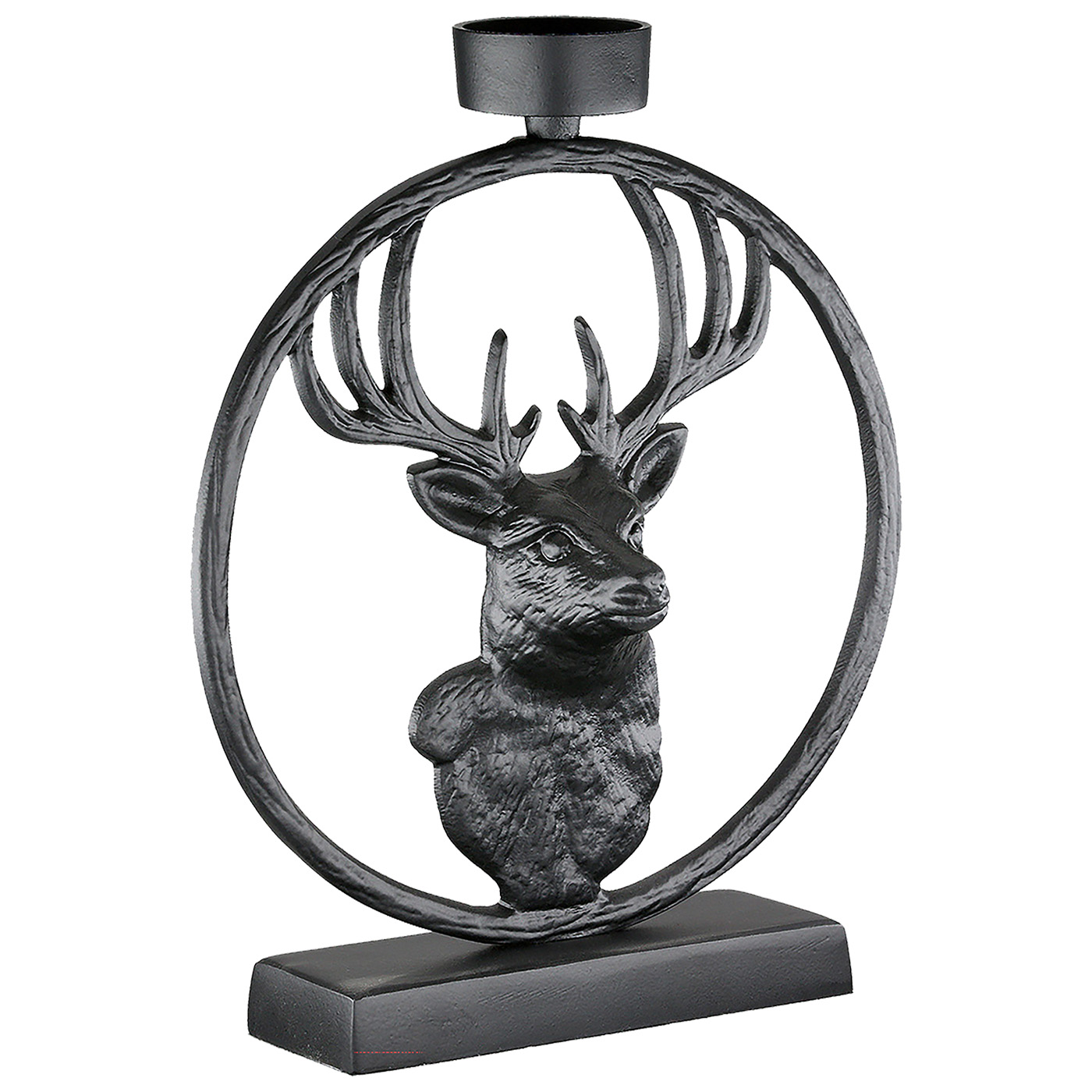 Dekorativer Teelichtleuchter rund "Deer in Circle“; aus matten, schwarzem Metall mit Hirschmotiv - für Teelichter oder kleiner Stumpenkerzen geeignet (nicht im Lieferumfang enthalten). Ideal für ein stimmungsvolles, jagdliches Ambiente mit Stil, Maße: 5x19x23cm