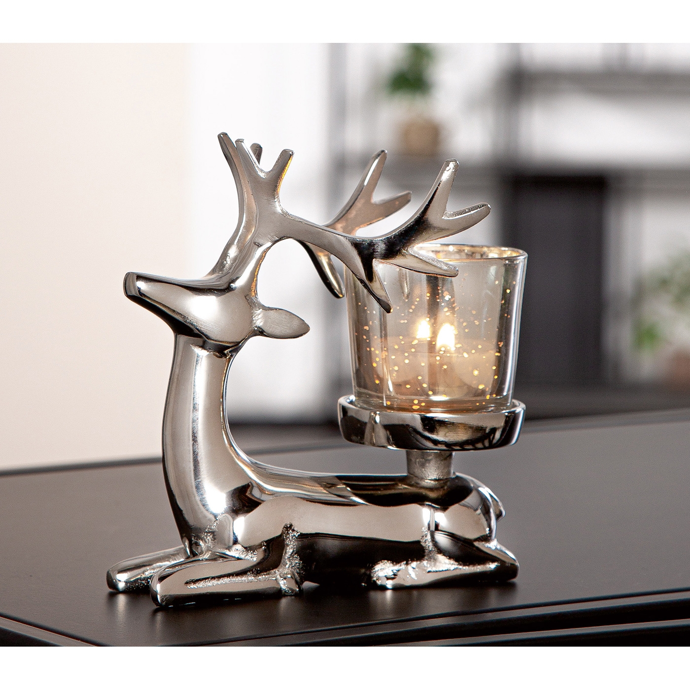 Stilvoller Teelichtleuchter, liegender Hirsch "Aksel", in silberfarben, glänzend, aus Aluminium, mit Glaseinsatz (Ø 6cm, Höhe 5,5 cm) - ideal für eine gemütliche Atmosphäre in der kalten Jahreszeit. Gesamt-Maße: L 8 x B 13,5 x H 14 cm. Ein Teelicht ist nicht im Lieferumfang enthalten.