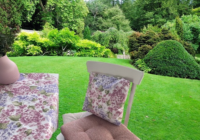 Tischdecke mit floralem Hortensienmotiv für gemütliche Tischrunden.