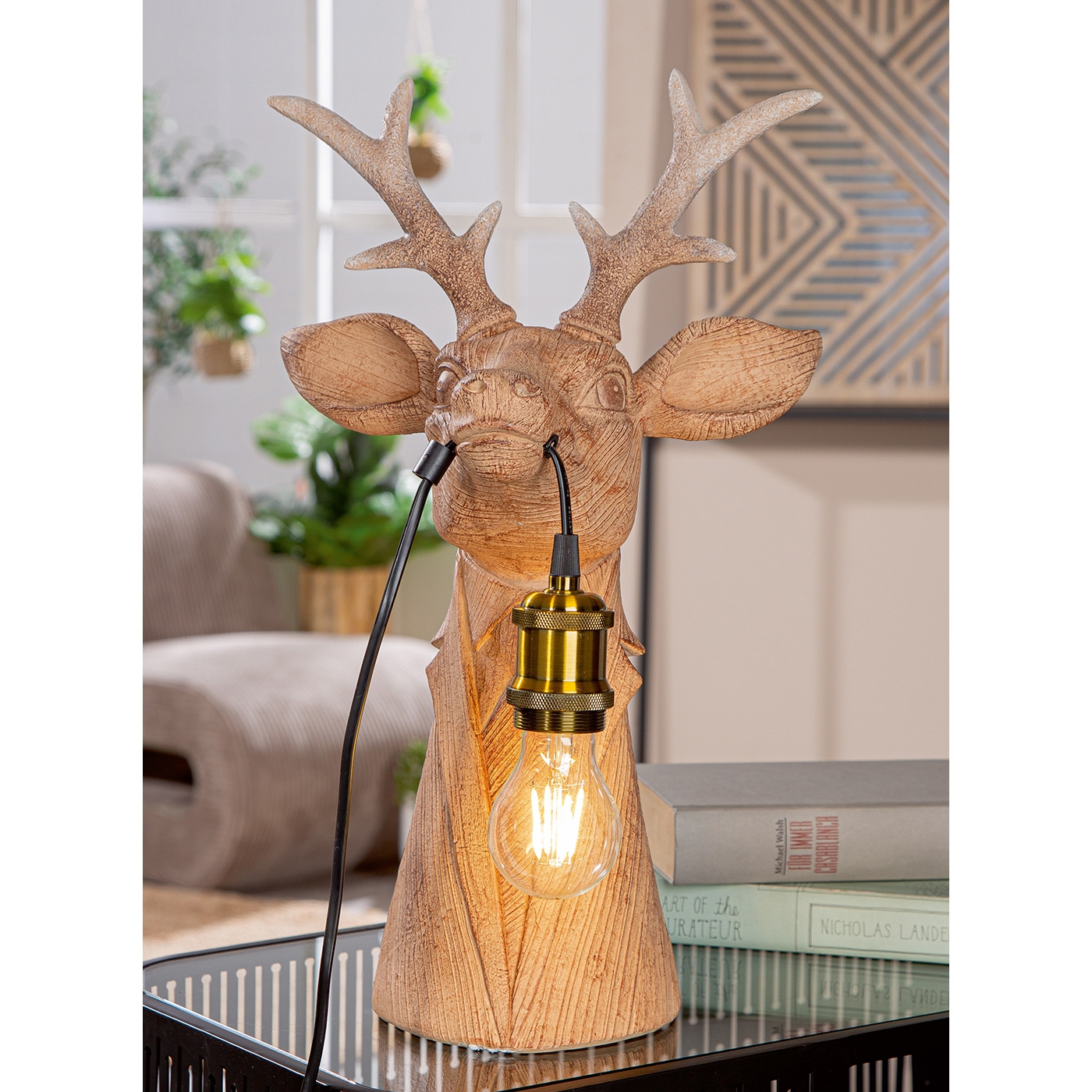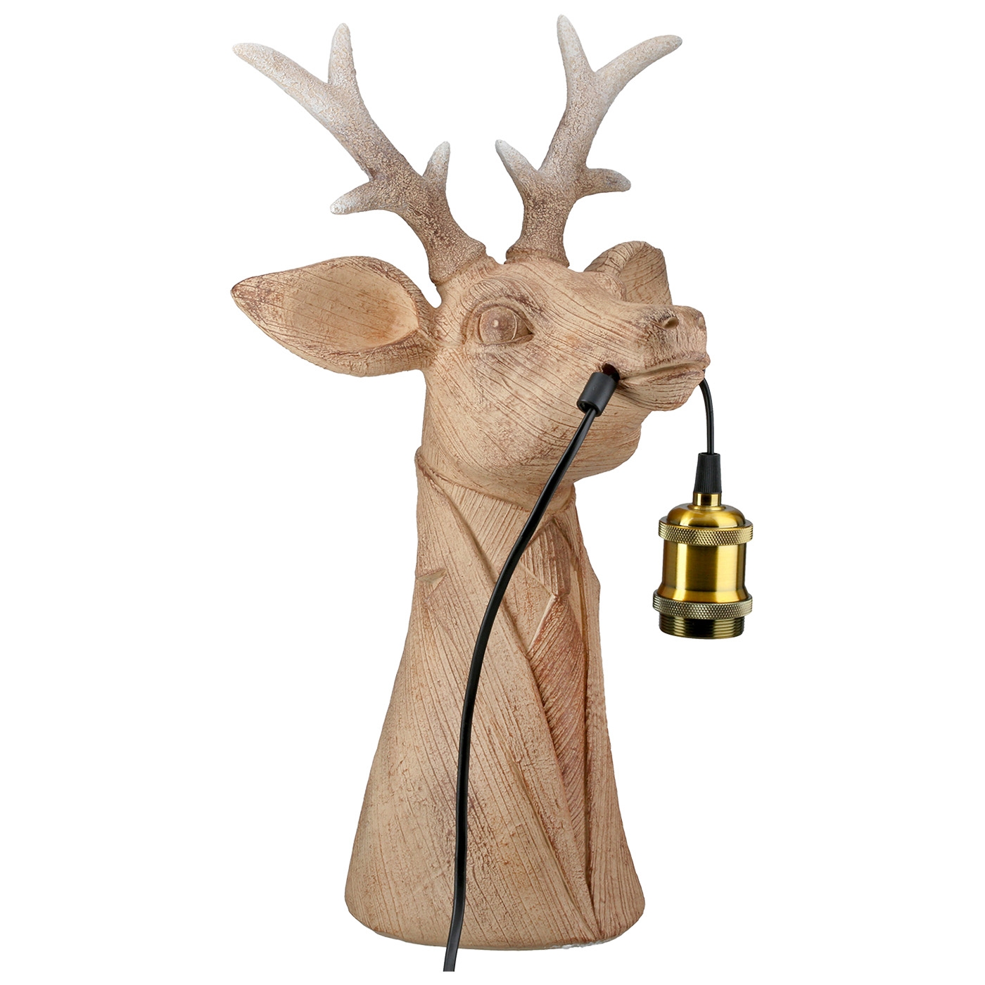 "Gentleman deer" - ein echter Blickfang. Originelle Tischleuchte Hirsch aus braunem Kunstharz in Holzoptik. Die ideale Leuchte für eine gemütliche Stimmung zu Hause. Die Unterseite ist mit einem Filzgleiter versehen, der ein kratzfreies Aufstellen garantiert. Die angehängte Fassung benötigt Leuchtmittel E27 bis max. 40 Watt. Die Kabellänge beträgt ca. 160 cm. Maße: L 22,5 x B 27 x H 45 cm.