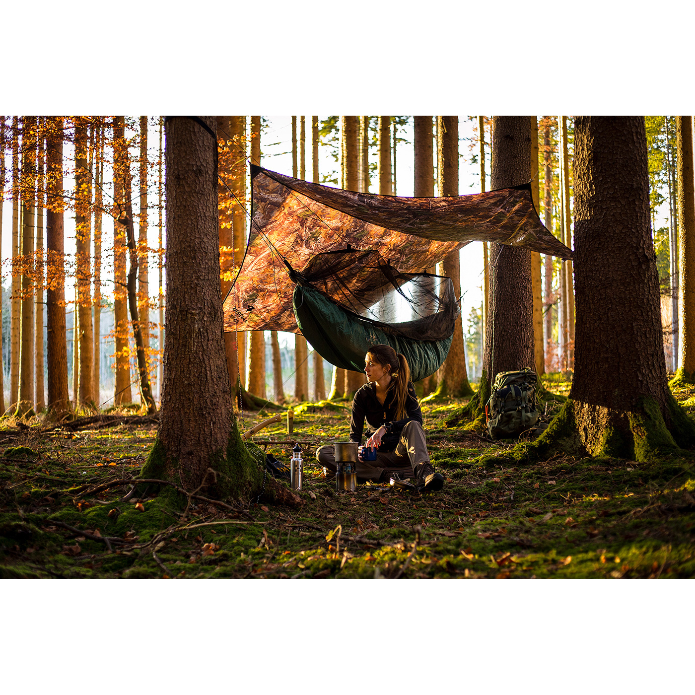 Der trapezförmige Schnitt des Tarps lässt genügend Luft zirkulieren und schützt dennoch vor Regen, Sonne und herabfallenden Blättern. Alle Abspannpunkte sind mit kleinen Taschen für die Leinen versehen. Für eine optimale Tarnung zu nahezu allen Jahreszeiten: Die Waldoptik kombiniert ein Muster aus Blättern, Bäumen und den typischen Farben des Waldes. Damit fügt sich das Tarp unauffällig in den Hintergrund ein und optische Silhouetten verschwimmen. Robust und vielseitig einsetzbar.