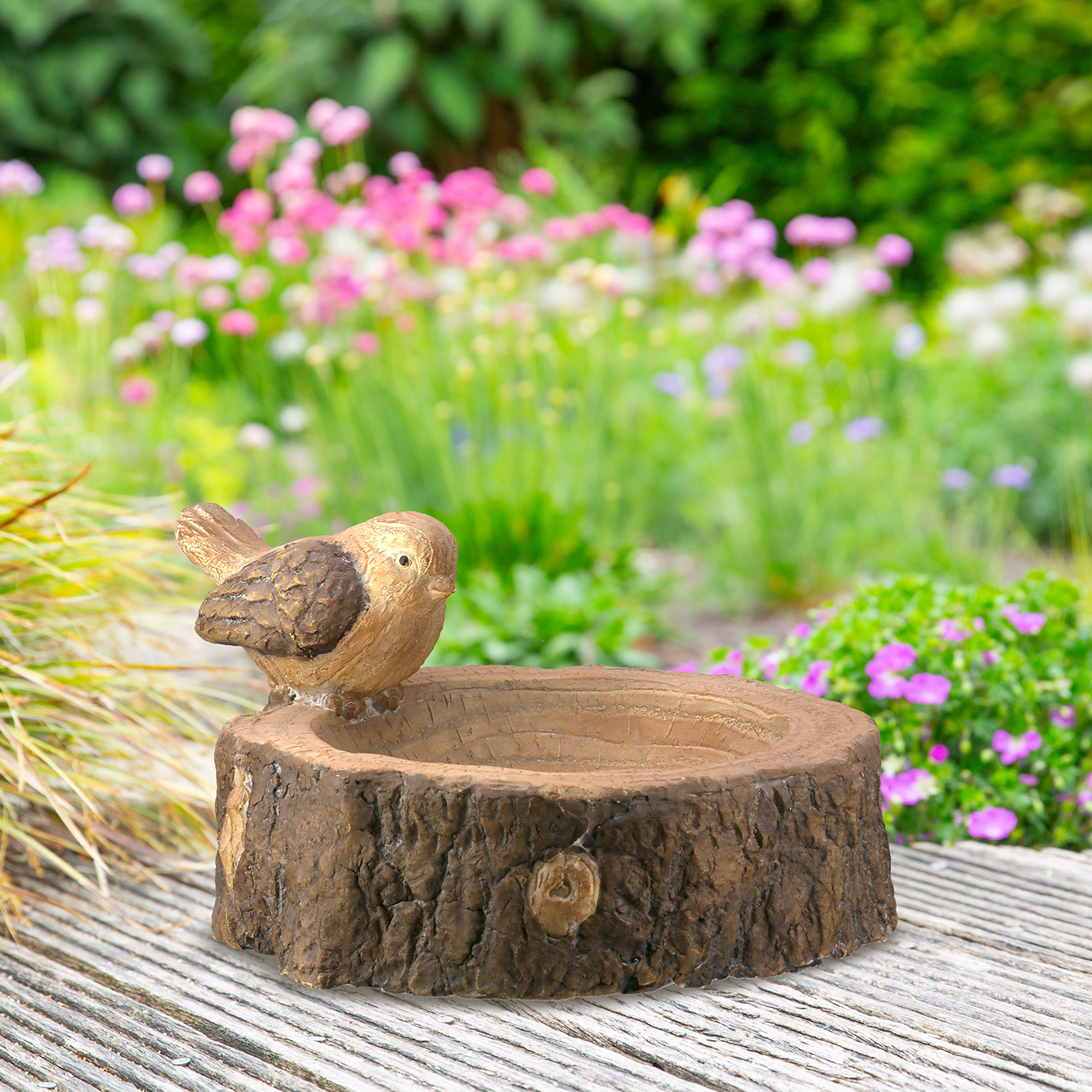Rustikale, wetterfeste, natürlich wirkende, runde Vogeltränke Tronco – Baumstamm-Motiv mit Vogel, aus Spezialkeramik in Holzoptik. Maße: 30 x 24,5 x 15,5 cm. Gewicht: 1,62kg
