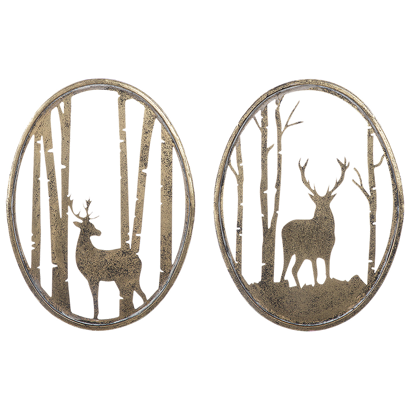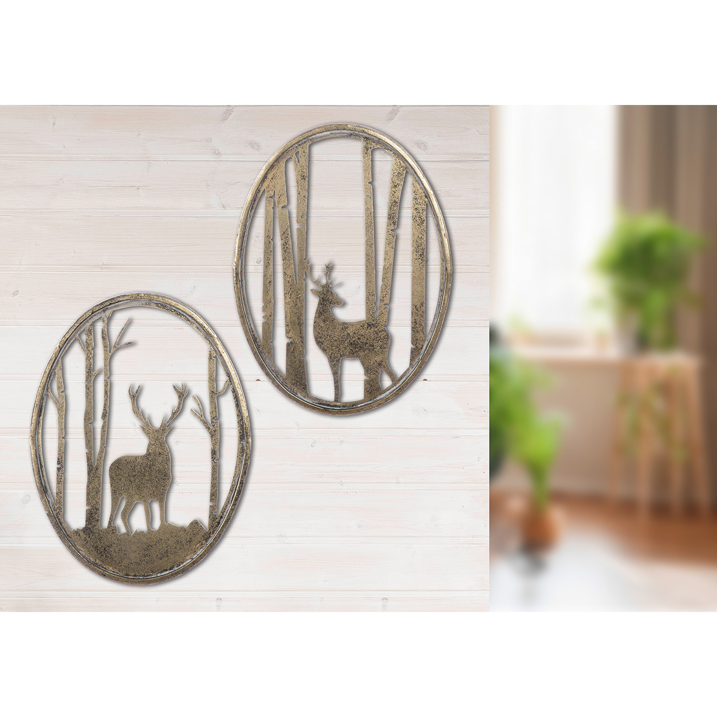 Wandrelief, oval, Hirschmotive im Wald aus goldfarbenen Metall, als 2er Set, wie abgebildet. Maße: 2 × 30,5 × 40cm