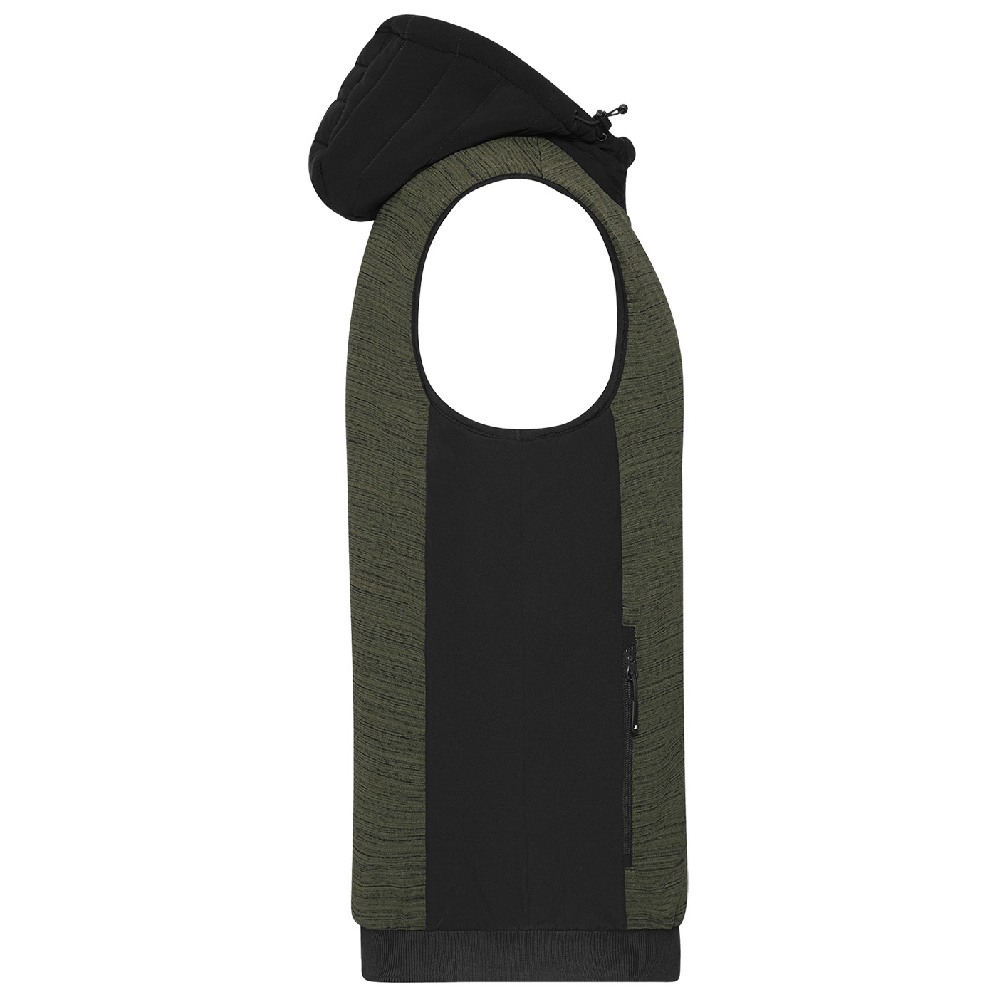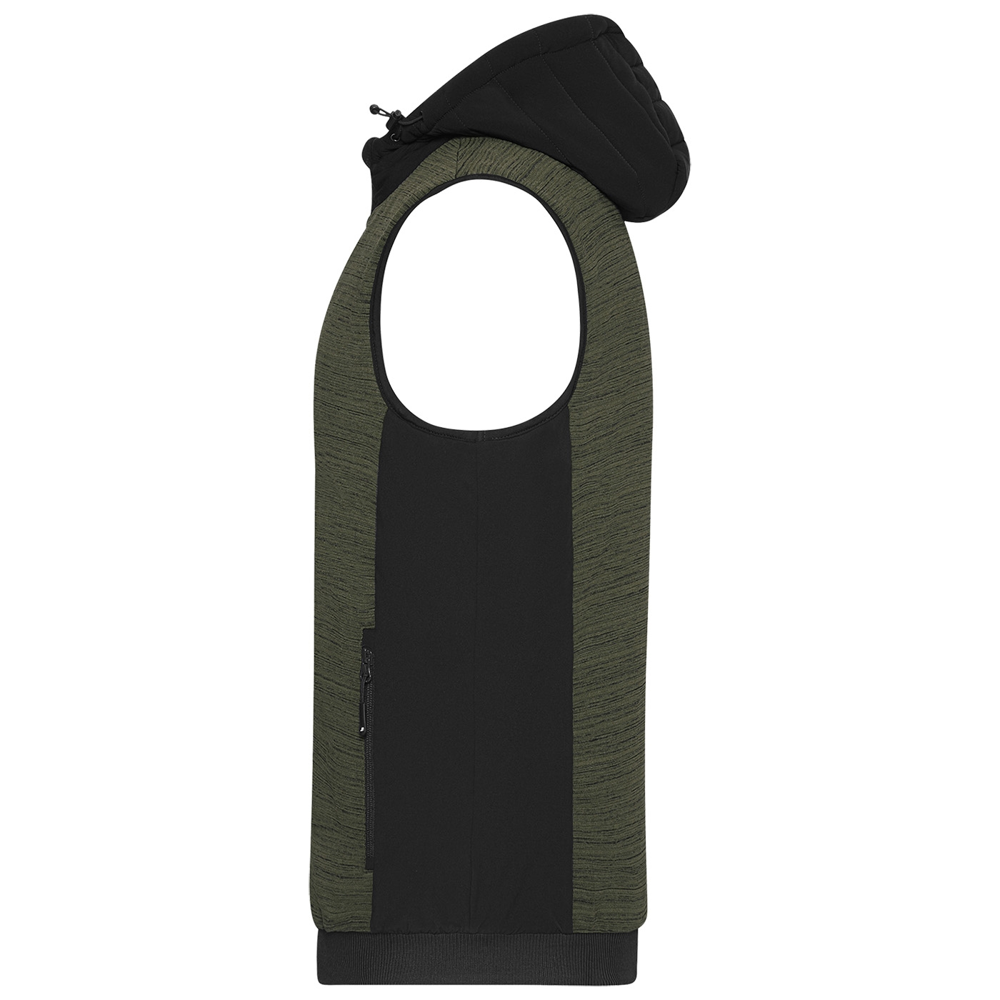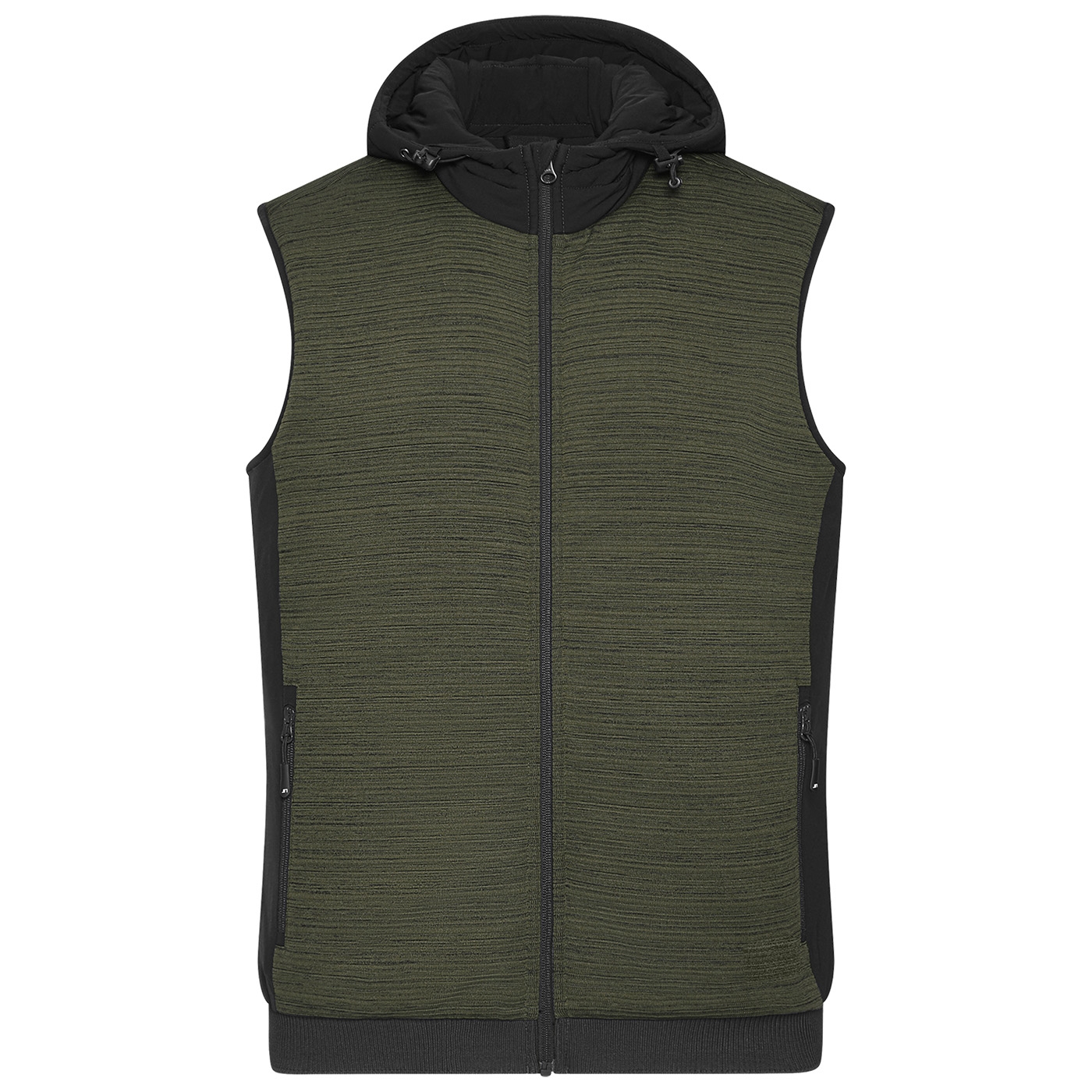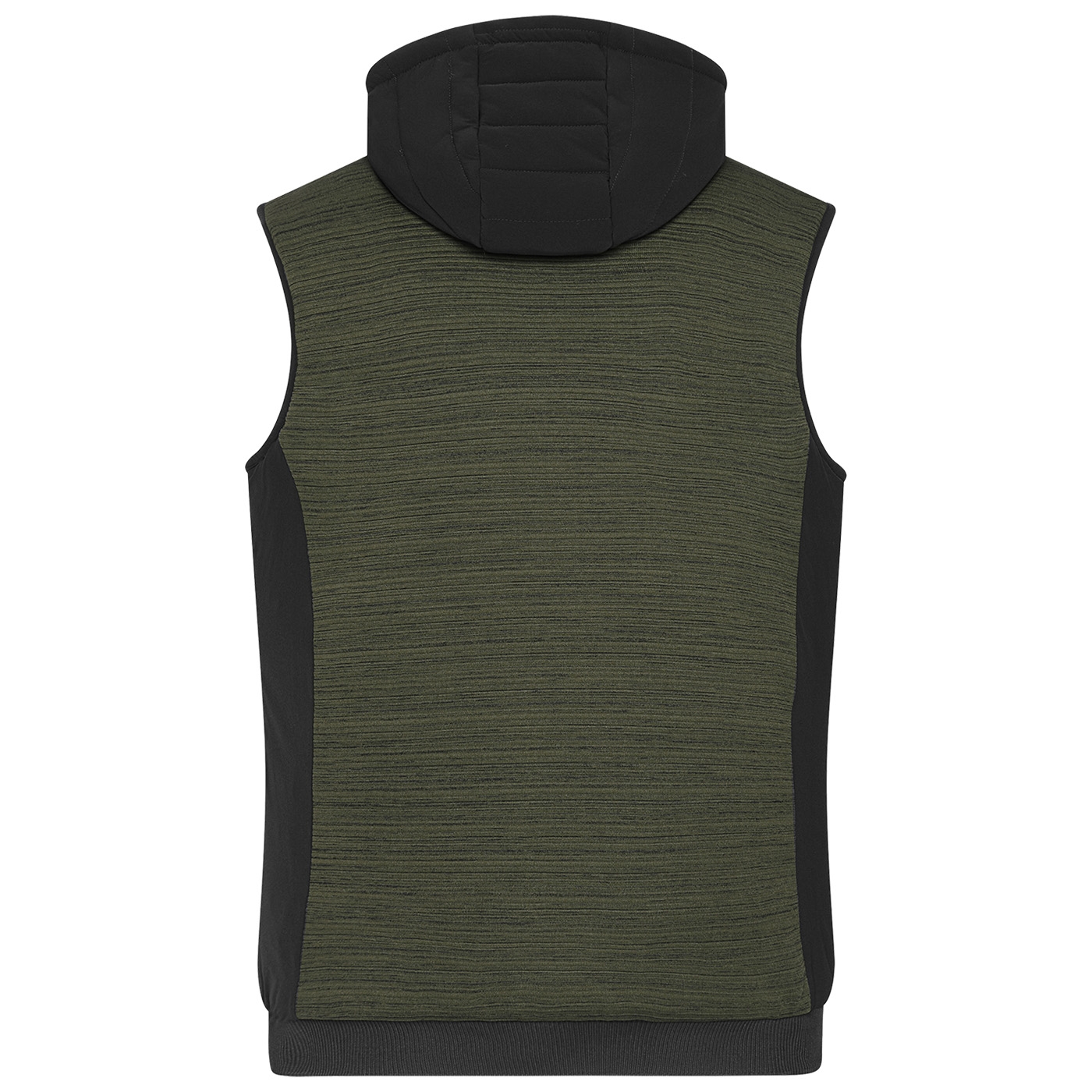 Leicht taillierte Weste im attraktiven Materialmix. Pflegeleichter Strickfleece kombiniert mit elastischen Einsätzen, mit wärmender sorona®AURA Wattierung (aus nachwachsenden Rohstoffen). Weste mit angeschnittener, verstellbarer Kapuze, durchgehendem YKK Frontreißverschluss mit Kinnschutz, 2 Seitentaschen mit Reißverschluss, 1 Innentasche mit Klettverschluss und elastischem Bündchen am Saum. Innenverarbeitung mit abgesteppter Wattierung im Vorder- und Rückenteil sowie in der Kapuze.
