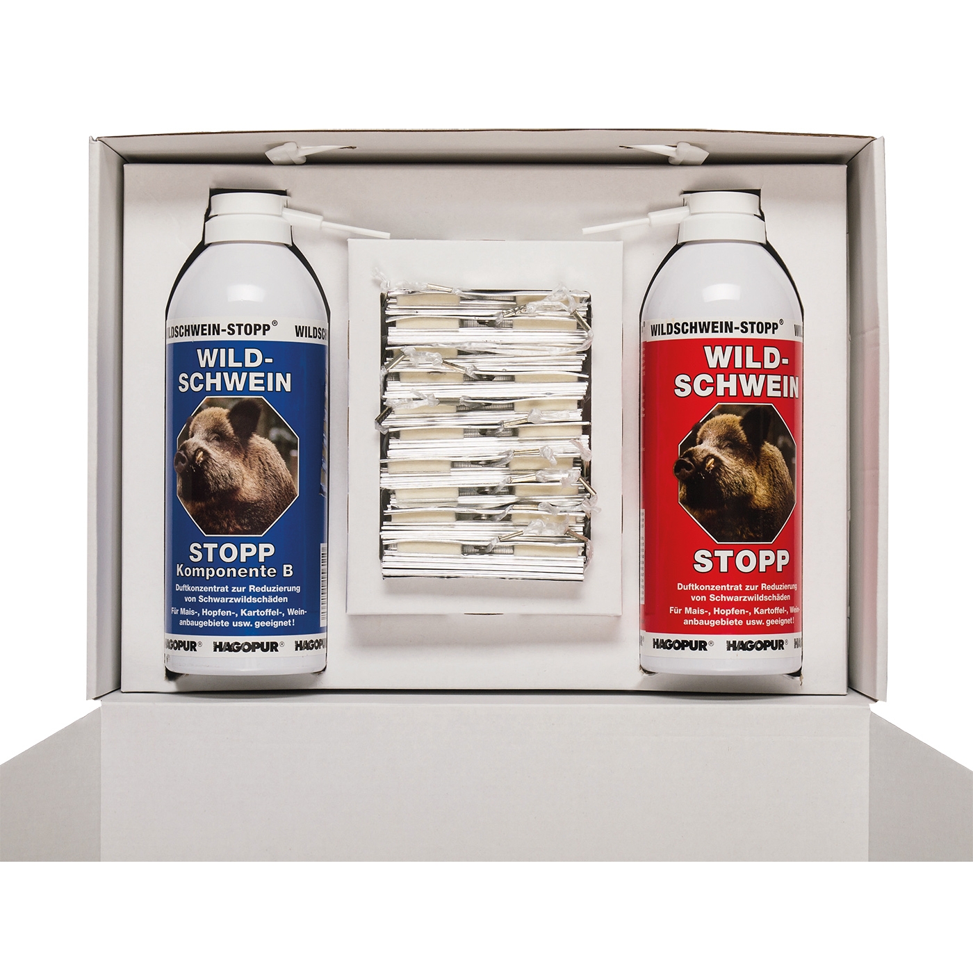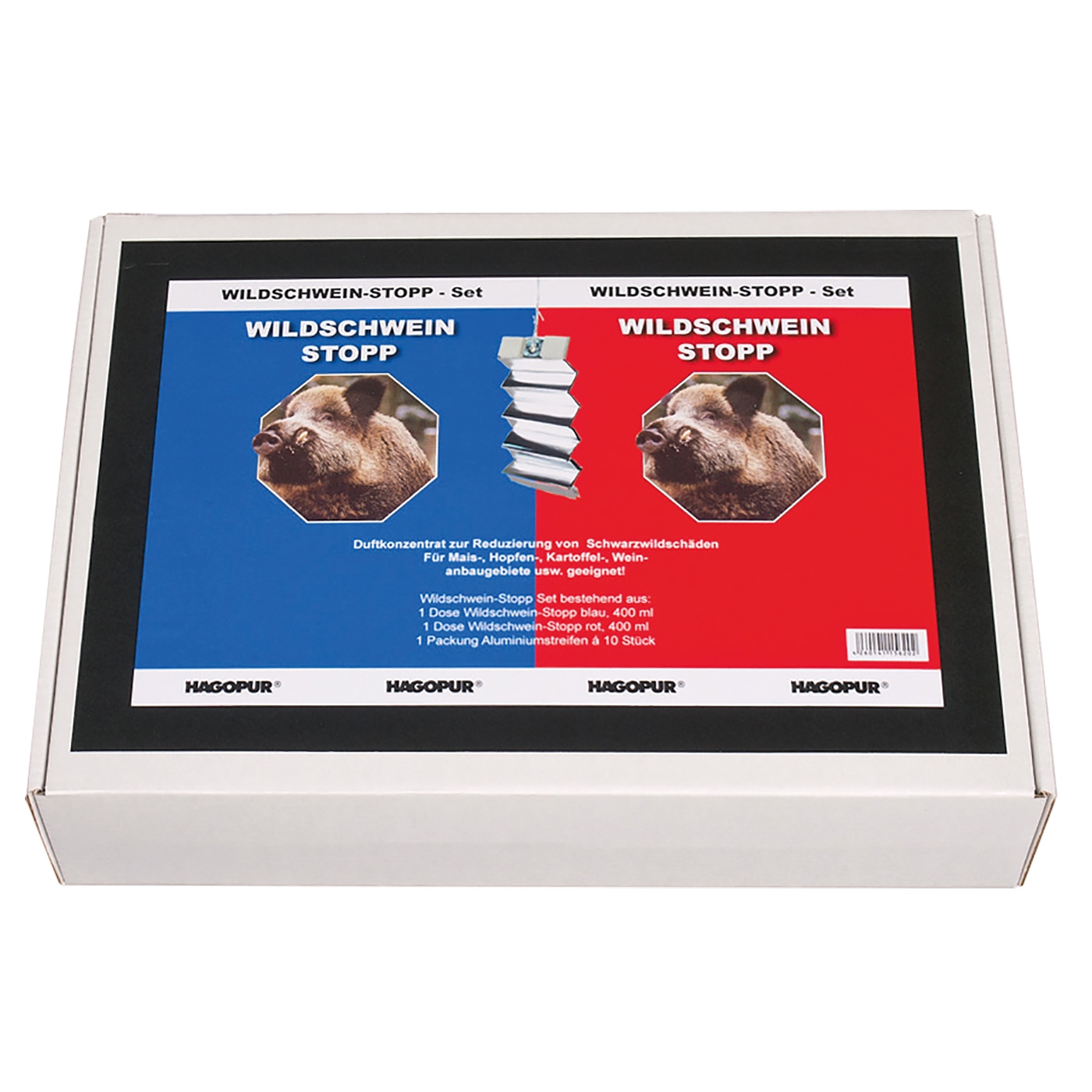 Bestehend aus jeweils 400 ml Wildschweinstop rot und blau, incl. 10 Alustreifen.